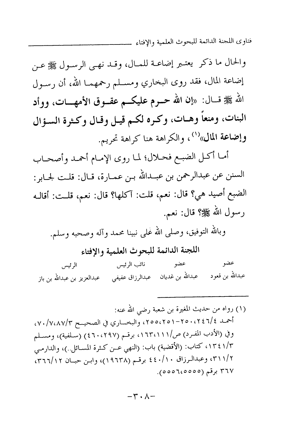 والحال ما ذكر يعتبر إضاعة للمال، وقد نهى الرسول صلى الله عليه وسلم عن إضاعة المال، فقد روى البخاري ومسلم رحمهما الله، أن رسول الله صلى الله عليه وسلم قال: «إن الله حرم عليكم عقوق الأمهات، ووأد البنات، ومنعا وهات، وكره لكم قيل وقال، وكثرة السؤال، وإضاعة المال (¬1) » والكراهة هنا كراهة تحريم.
