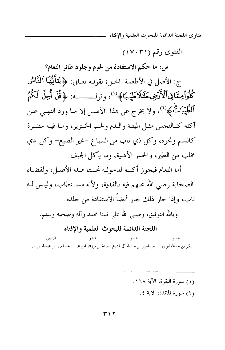 أما النعام فيجوز أكله لدخوله تحت هذا الأصل، ولقضاء الصحابة رضي الله عنهم فيه بالفدية؛ ولأنه مستطاب، وليس له ناب، وإذا جاز ذلك جاز أيضا الاستفادة من جلده.