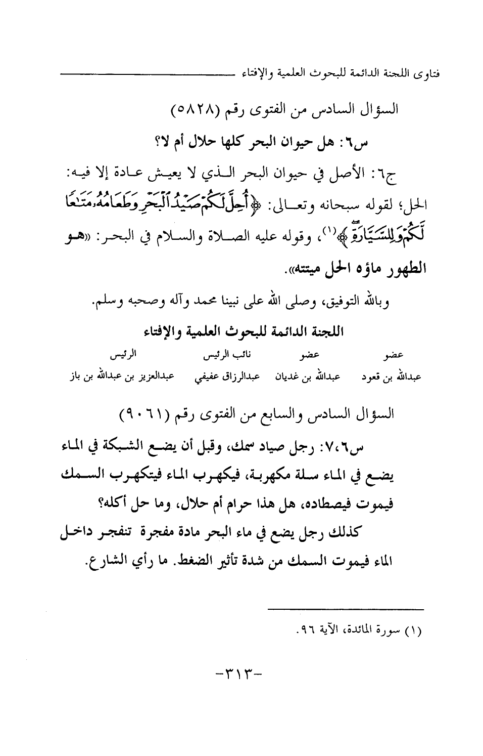 ج6: الأصل في حيوان البحر الذي لا يعيش عادة إلا فيه: الحل؛ لقوله سبحانه وتعالى: {أُحِلَّ لَكُمْ صَيْدُ الْبَحْرِ وَطَعَامُهُ مَتَاعًا لَكُمْ وَلِلسَّيَّارَةِ} (¬1) وقوله عليه الصلاة والسلام في البحر: «هو الطهور ماؤه الحل ميتته (¬2) » .