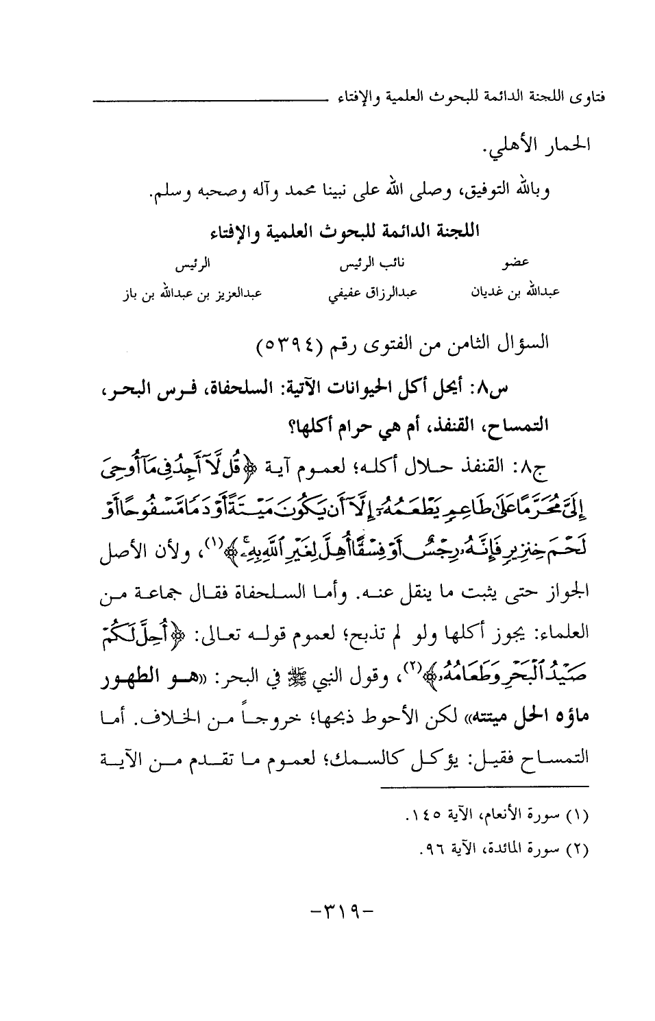 س 8: أيحل أكل الحيوانات الآتية: السلحفاة، فرس البحر، التمساح، القنفذ، أم هي حرام أكلها؟