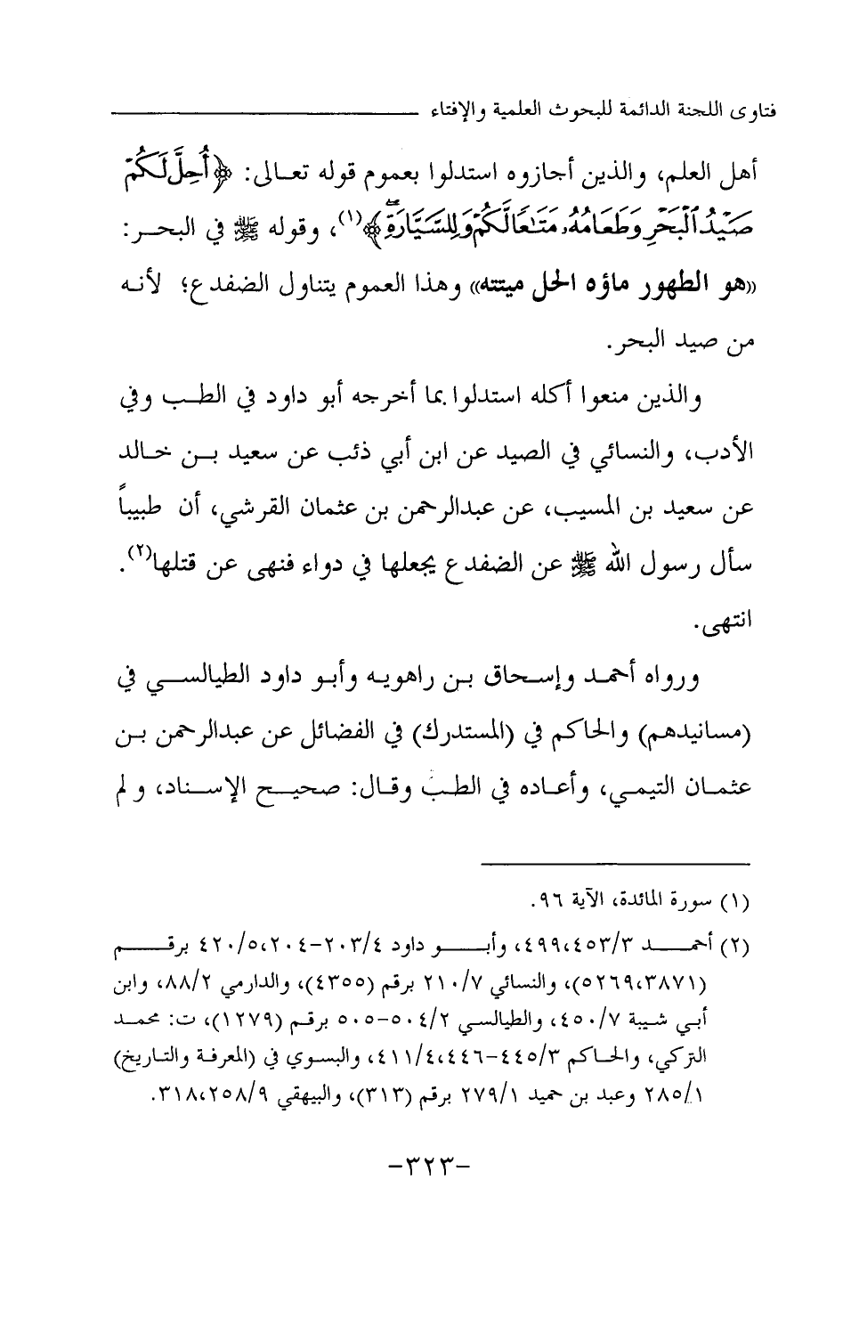 أهل العلم، والذين أجازوه استدلوا بعموم قوله تعالى: {أُحِلَّ لَكُمْ صَيْدُ الْبَحْرِ وَطَعَامُهُ مَتَاعًا لَكُمْ وَلِلسَّيَّارَةِ} (¬1) وقوله - صلى الله عليه وسلم - في البحر: «هو الطهور ماؤه الحل ميتته (¬2) » وهذا العموم يتناول الضفدع؛ لأنه من صيد البحر.