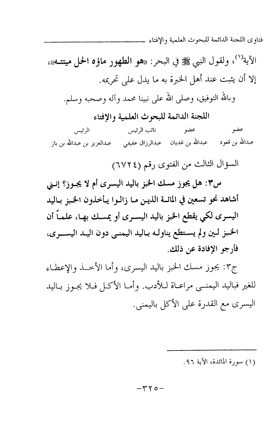 س3: هل يجوز مسك الخبز باليد اليسرى أم لا يجوز؟ إنني أشاهد نحو تسعين في المائة الذين ما زالوا يأخذون الخبز باليد اليسرى لكي يقطع الخبز باليد اليسرى أو يمسك بها، علما بأن الخبز لين ولم يستطع يناوله باليد اليمنى دون اليد اليسرى، فأرجو الإفادة عن ذلك.