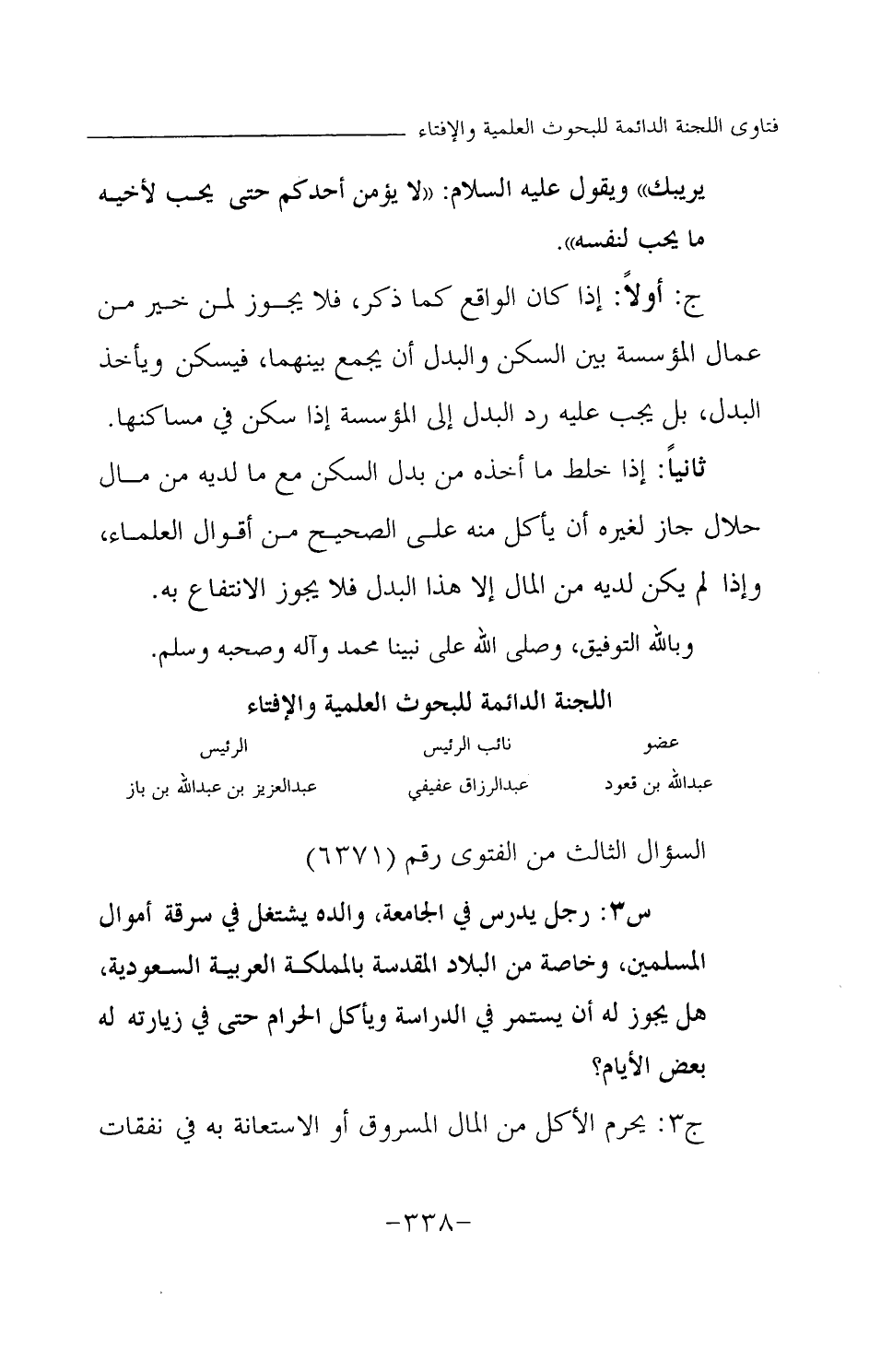 س3: رجل يدرس في الجامعة، والده يشتغل في سرقة أموال المسلمين، وخاصة من البلاد المقدسة بالمملكة العربية السعودية، هل يجوز له أن يستمر في الدراسة ويأكل الحرام حتى في زيارته له بعض الأيام؟