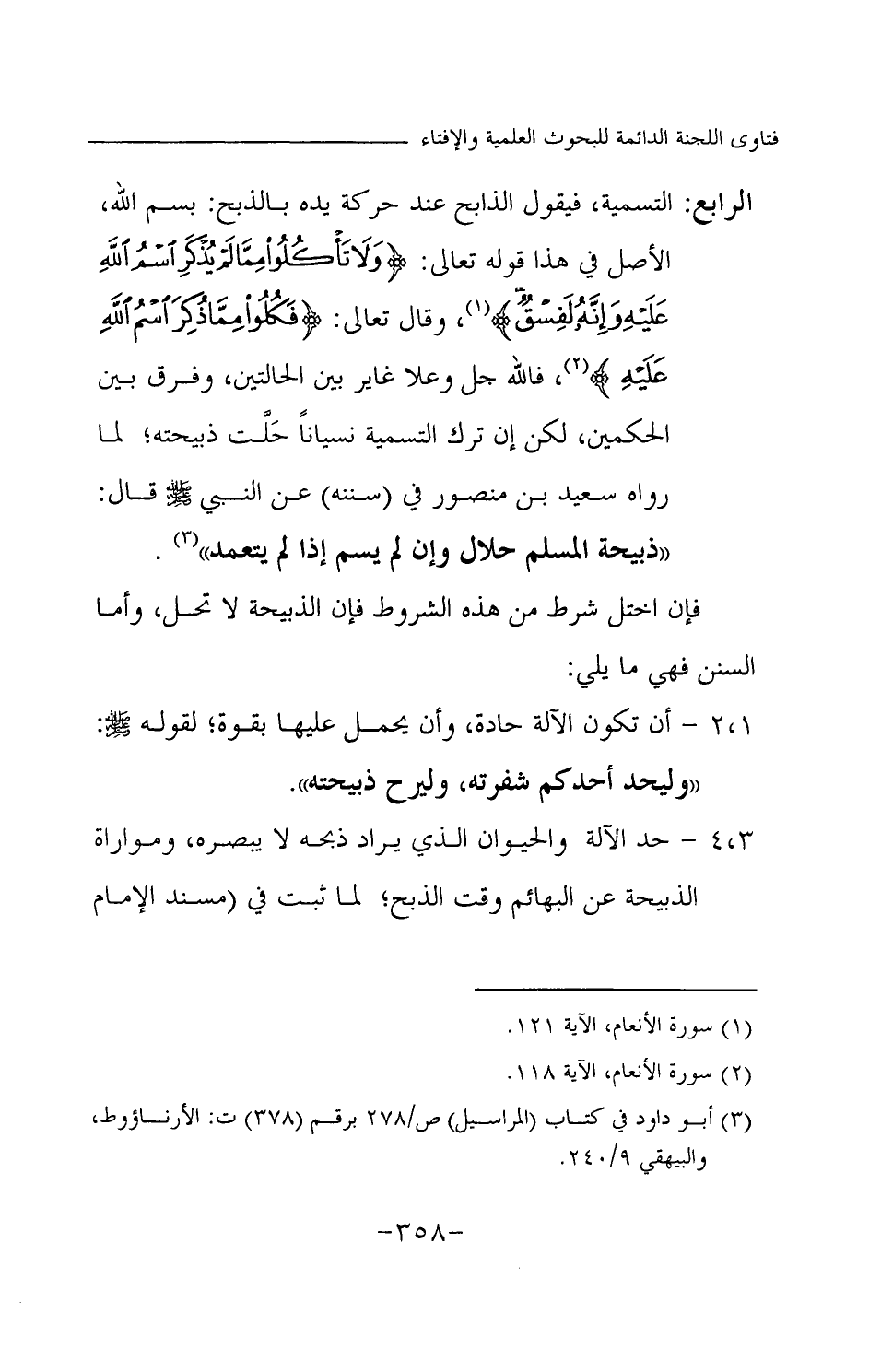 الرابع: التسمية، فيقول الذابح عند حركة يده بالذبح: بسم الله، الأصل في هذا قوله تعالى: {وَلَا تَأْكُلُوا مِمَّا لَمْ يُذْكَرِ اسْمُ اللَّهِ عَلَيْهِ وَإِنَّهُ لَفِسْقٌ} (¬1) وقال تعالى: {فَكُلُوا مِمَّا ذُكِرَ اسْمُ اللَّهِ عَلَيْهِ} (¬2) فالله جل وعلا غاير بين الحالتين، وفرق بين الحكمين، لكن إن ترك التسمية نسيانا حلت ذبيحته؛ لما- رواه سعيد بن منصور في (سننه) «عن النبي - صلى الله عليه وسلم - قال: ذبيحة المسلم حلال وإن لم يسم إذا لم يتعمد (¬3) » .