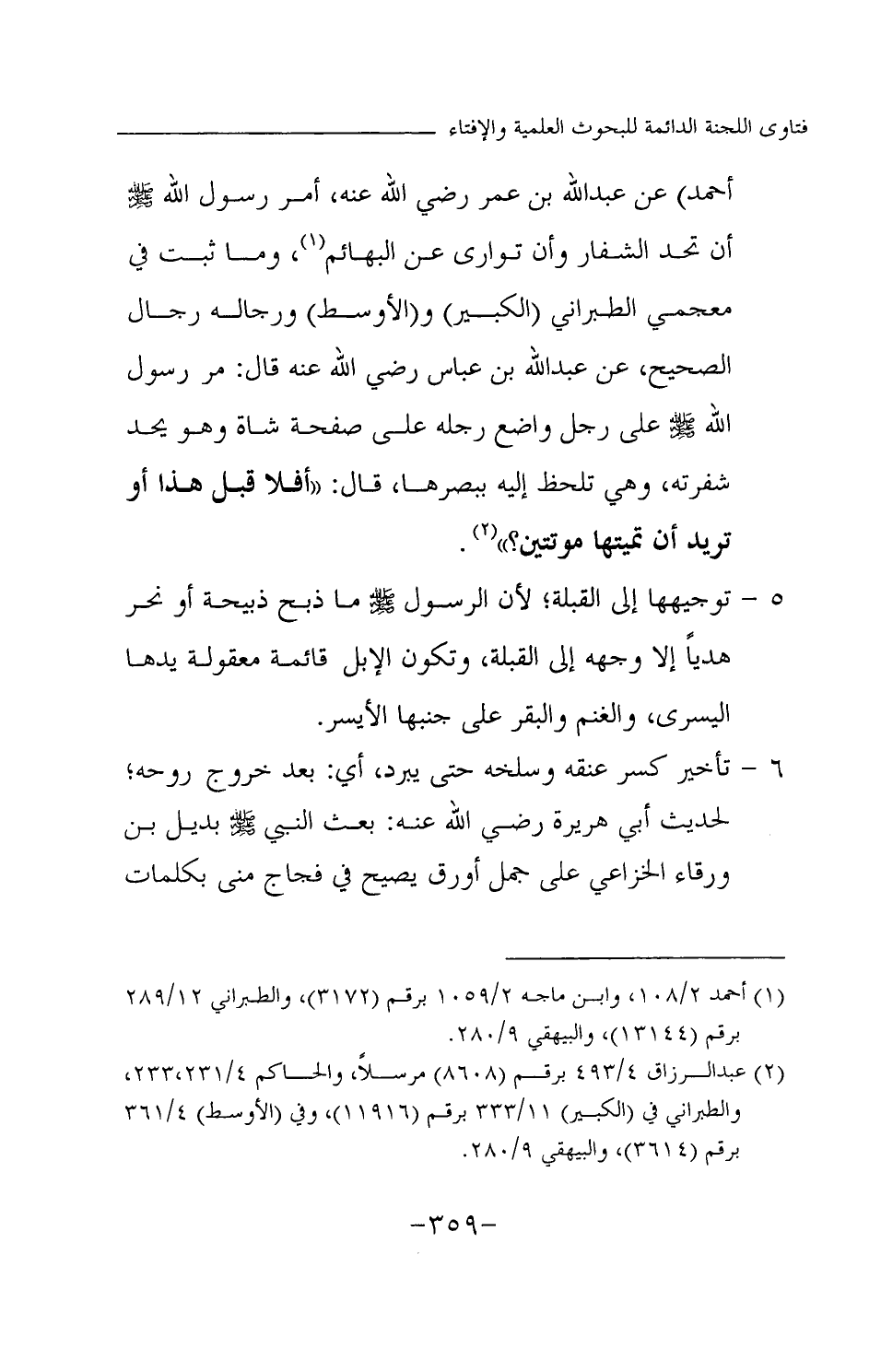 أحمد) «عن عبد الله بن عمر - رضي الله عنه - أمر رسول الله - صلى الله عليه وسلم - أن تحد الشفار، وأن توارى عن البهائم (¬1) » وما ثبت في معجمي الطبراني (الكبير) و (الأوسط) ورجاله رجال الصحيح، «عن عبد الله بن عباس - رضي الله عنه - قال: مر رسول الله - صلى الله عليه وسلم - على رجل واضع رجله على صفحة شاة وهو يحد شفرته، وهي تلحظ إليه ببصرها، قال: أفلا قبل هذا، أوتريد أن تميتها موتتين؟ (¬2) » .