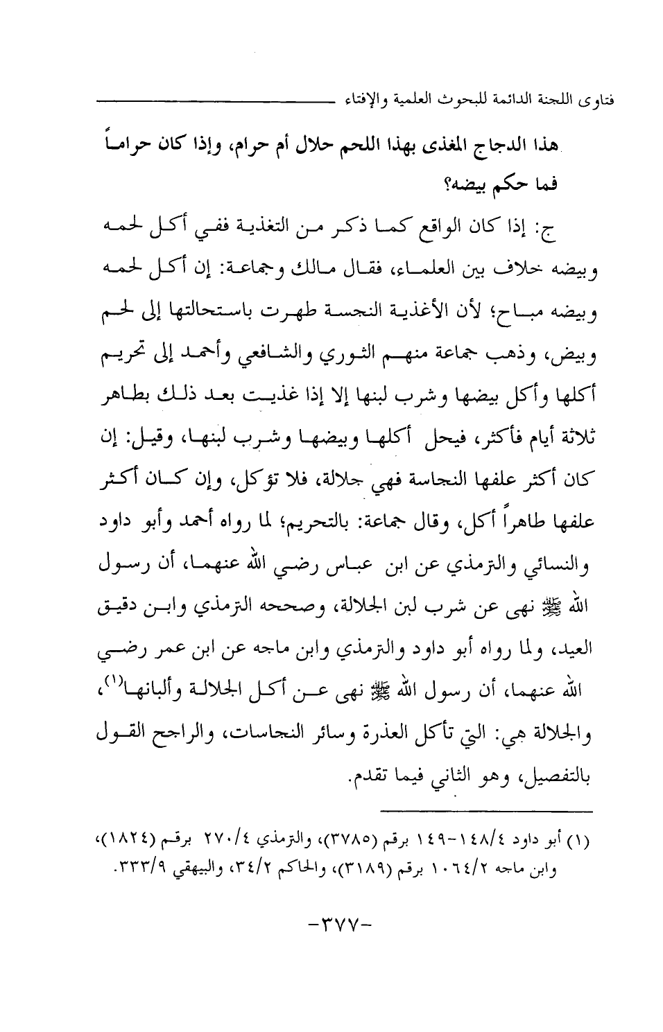ج: إذا كان الواقع كما ذكر من التغذية ففي أكل لحمه وبيضه خلاف بين العلماء، فقال مالك وجماعة: إن أكل لحمه وبيضه مباح؛ لأن الأغذية النجسة طهرت باستحالتها إلى لحم وبيض، وذهب جماعة منهم الثوري والشافعي وأحمد إلى تحريم أكلها وأكل بيضها وشرب لبنها إلا إذا غذيت بعد ذلك بطاهر ثلاثة أيام فأكثر، فيحل أكلها وبيضها وشرب لبنها، وقيل: إن كان أكثر علفها النجاسة فهي جلالة، فلا تؤكل، وإن كان أكثر علفها طاهرا أكل، وقال جماعة بالتحريم؛ لما رواه أحمد وأبو داود والنسائي والترمذي «عن ابن عباس - رضي الله عنهما -، أن رسول الله - صلى الله عليه وسلم - نهى عن شرب لبن الجلالة (¬1) » ، وصححه الترمذي وابن دقيق العيد، ولما رواه أبو داود والترمذي وابن ماجه «عن ابن عمر - رضي الله عنهما -، أن رسول الله - صلى الله عليه وسلم - نهى عن أكل الجلالة وألبانها (¬2) » والجلالة هي: التي تأكل العذرة وسائر النجاسات، والراجح القول بالتفصيل، وهو الثاني فيما تقدم.