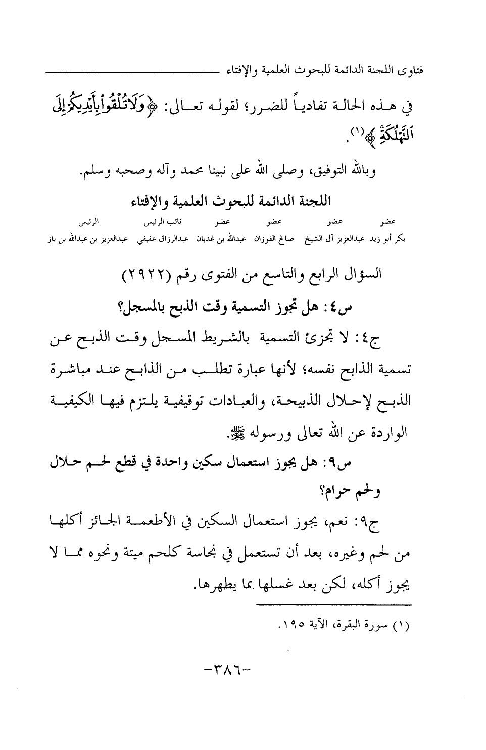 ج 4: لا تجزئ التسمية بالشريط المسجل وقت الذبح عن تسمية الذابح نفسه؛ لأنها عبارة تطلب من الذابح عند مباشرة الذبح لإحلال الذبيحة، والعبادات توقيفية يلتزم فيها الكيفية الواردة عن الله تعالى ورسوله صلى الله عليه وسلم.