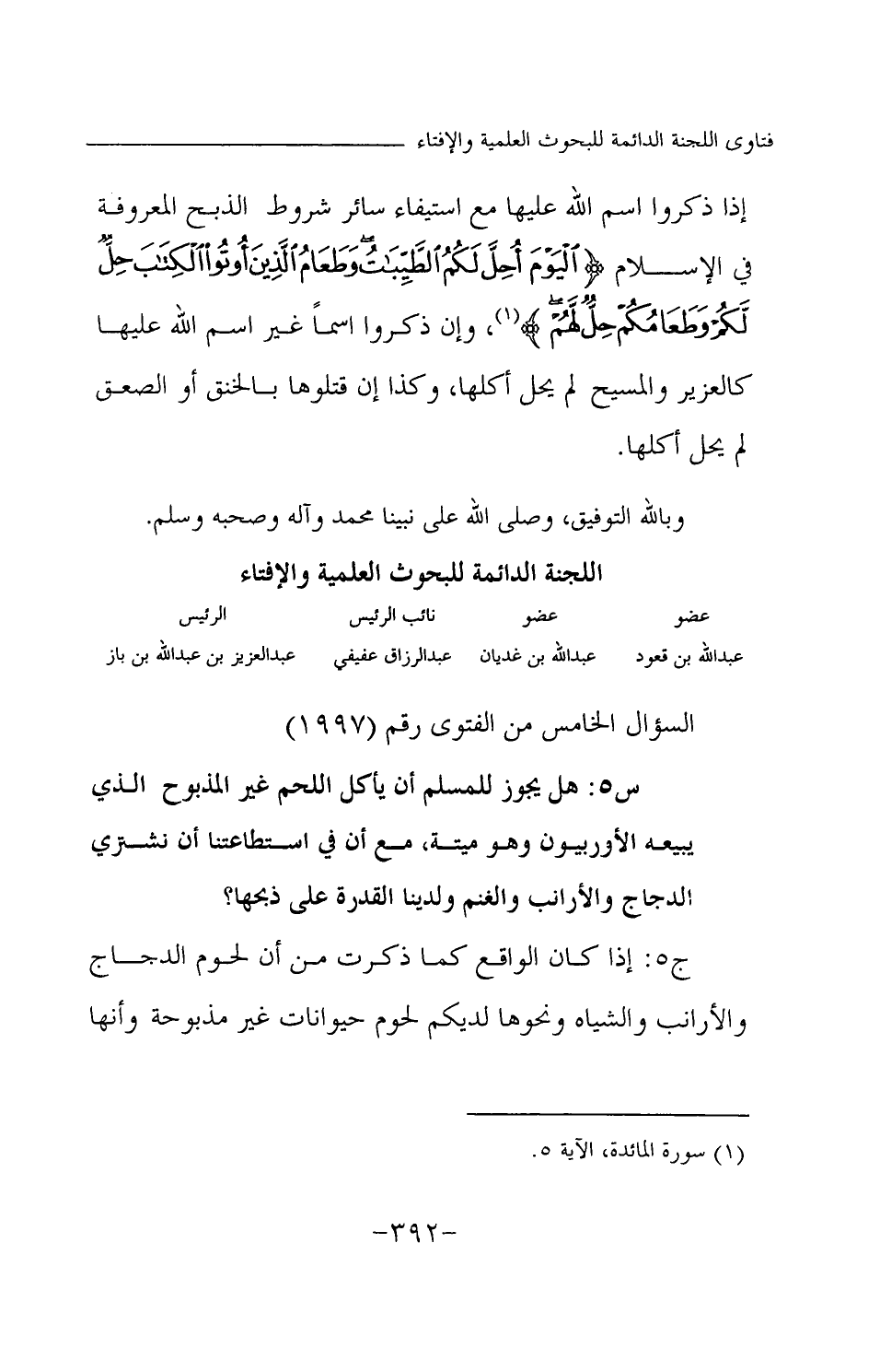 س5: هل يجوز للمسلم أن يأكل اللحم غير المذبوح الذي يبيعه الأوربيون وهو ميتة، مع أن في استطاعتنا أن نشتري الدجاج والأرانب والغنم ولدينا القدرة على ذبحها؟
