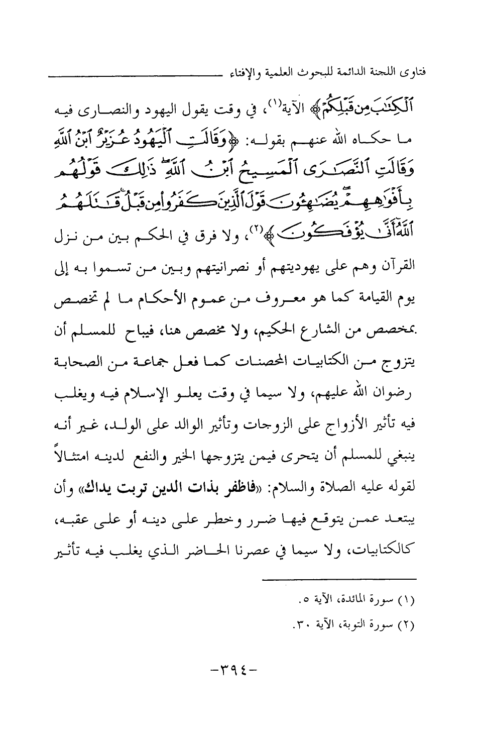في وقت يقول اليهود والنصارى فيه ما حكاه الله عنهم بقوله: {وَقَالَتِ الْيَهُودُ عُزَيْرٌ ابْنُ اللَّهِ وَقَالَتِ النَّصَارَى الْمَسِيحُ ابْنُ اللَّهِ ذَلِكَ قَوْلُهُمْ بِأَفْوَاهِهِمْ يُضَاهِئُونَ قَوْلَ الَّذِينَ كَفَرُوا مِنْ قَبْلُ قَاتَلَهُمُ اللَّهُ أَنَّى يُؤْفَكُونَ} (¬1) ولا فرق في الحكم بين من نزل القرآن وهم على يهوديتهم أو نصرانيتهم وبين من تسموا به إلى يوم القيامة كما هو معروف من عموم الأحكام ما لم تخصص بمخصص من الشارع الحكيم، ولا مخصص هنا، فيباح للمسلم أن يتزوج من الكتابيات المحصنات كما فعل جماعة من الصحابة رضوان الله عليهم، ولا سيما في وقت يعلو الإسلام فيه ويغلب فيه تأثير الأزواج على الزوجات وتأثير الوالد على الولد، غير أنه ينبغي للمسلم أن يتحرى فيمن يتزوجها الخير والنفع لدينه امتثالا لقوله عليه الصلاة والسلام: «فاظفر بذات الدين تربت يداك (¬2) » وأن يبتعد عمن يتوقع فيها ضرر وخطر على دينه أو على عقبه، كالكتابيات، ولا سيما في عصرنا الحاضر الذي يغلب فيه تأثير