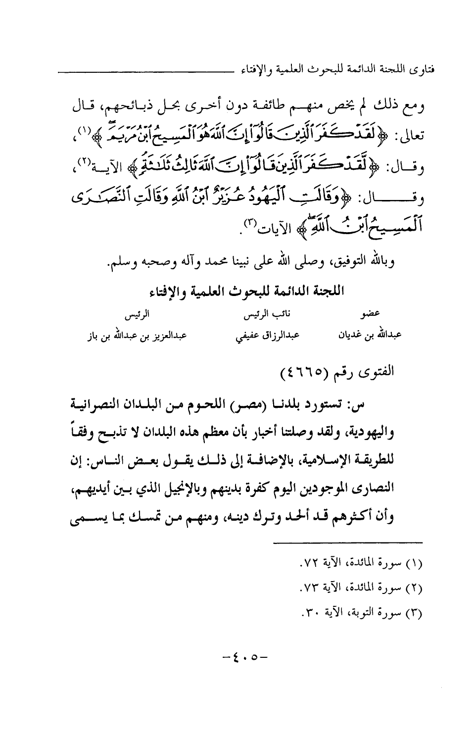 ومع ذلك لم يخص منهم طائفة دون أخرى بحل ذبائحهم، قال تعالى: {لَقَدْ كَفَرَ الَّذِينَ قَالُوا إِنَّ اللَّهَ هُوَ الْمَسِيحُ ابْنُ مَرْيَمَ} (¬1) وقال: {لَقَدْ كَفَرَ الَّذِينَ قَالُوا إِنَّ اللَّهَ ثَالِثُ ثَلَاثَةٍ} (¬2) الآية وقال: {وَقَالَتِ الْيَهُودُ عُزَيْرٌ ابْنُ اللَّهِ وَقَالَتِ النَّصَارَى الْمَسِيحُ ابْنُ اللَّهِ} (¬3) الآيات