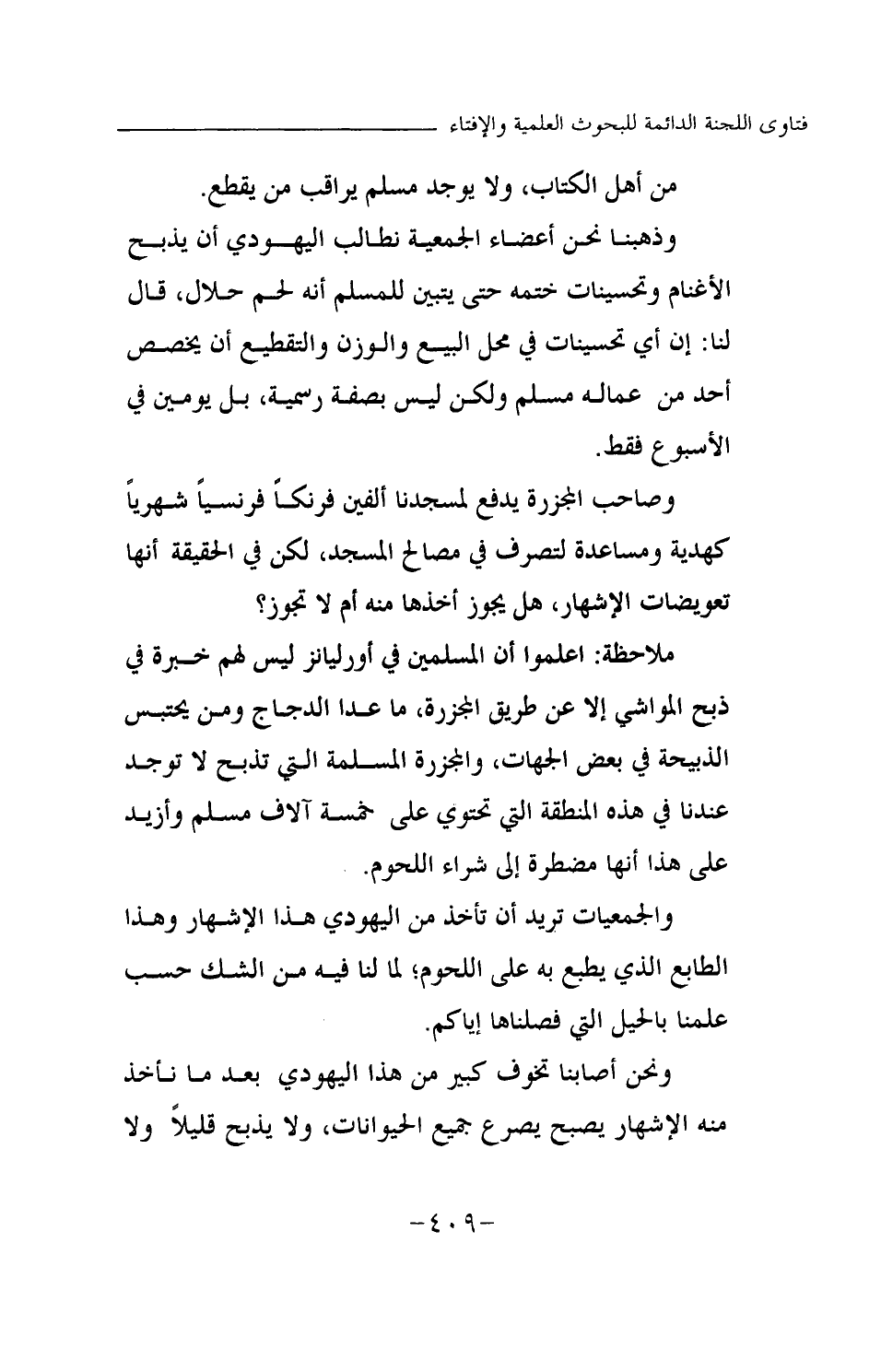 ملاحظة: اعلموا أن المسلمين في أورليانز ليس لهم خبرة في ذبح المواشي إلا عن طريق المجزر، ما عدا الدجاج ومن يحتبس الذبيحة في بعض الجهات، والمجزرة المسلمة التي تذبح لا توجد عندنا في هذه المنطقة التي تحتوي على خمسة آلاف مسلم وأزيد على هذا أنها مضطرة إلى شراء اللحوم.