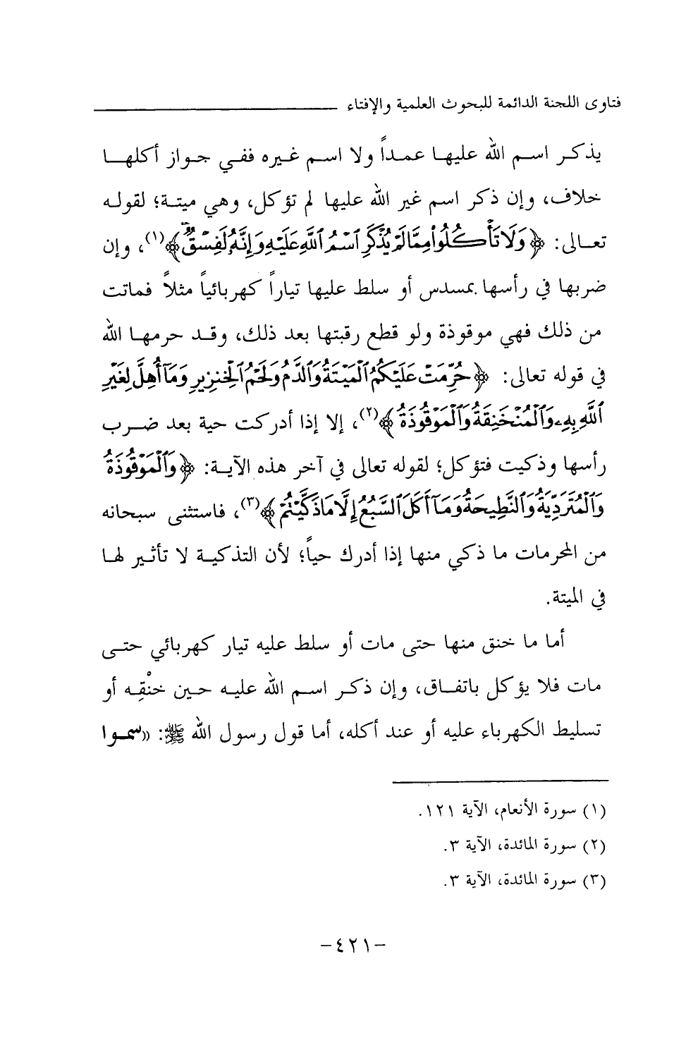 يذكر اسم الله عليها عمدا ولا اسم غيره ففي جواز أكلها خلاف، وإن ذكر اسم غير الله عليها لم تؤكل، وهي ميتة؛ لقوله تعالى: {وَلَا تَأْكُلُوا مِمَّا لَمْ يُذْكَرِ اسْمُ اللَّهِ عَلَيْهِ وَإِنَّهُ لَفِسْقٌ} (¬1) وإن ضربها في رأسها بمسدس أو سلط عليها تيارا كهربائيا مثلا فماتت من ذلك فهي موقوذة ولو قطع رقبتها بعد ذلك، وقد حرمها الله في قوله تعالى: {حُرِّمَتْ عَلَيْكُمُ الْمَيْتَةُ وَالدَّمُ وَلَحْمُ الْخِنْزِيرِ وَمَا أُهِلَّ لِغَيْرِ اللَّهِ بِهِ وَالْمُنْخَنِقَةُ وَالْمَوْقُوذَةُ} (¬2) إلا إذا أدركت حية بعد ضرب رأسها وذكيت فتؤكل؛ لقوله تعالى في آخر هذه الآية: {وَالْمَوْقُوذَةُ وَالْمُتَرَدِّيَةُ وَالنَّطِيحَةُ وَمَا أَكَلَ السَّبُعُ إِلَّا مَا ذَكَّيْتُمْ} (¬3) فاستثنى سبحانه من المحرمات ما ذكي منها إذا أدرك حيا؛ لأن التذكية لا تأثير لها في الميتة.