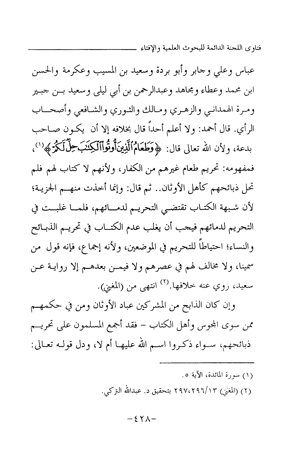 عباس وعلي وجابر وأبو بردة وسعيد بن المسيب وعكرمة والحسن بن محمد وعطاء ومجاهد وعبد الرحمن بن أبي ليلى وسعيد بن جبير ومرة الهمداني والزهري ومالك والثوري والشافعي وأصحاب الرأي. قال أحمد: ولا أعلم أحدا قال بخلافه إلا أن يكون صاحب بدعة، ولأن الله تعالى قال: {وَطَعَامُ الَّذِينَ أُوتُوا الْكِتَابَ حِلٌّ لَكُمْ} (¬1) فمفهومه: تحريم طعام غيرهم من الكفار، ولأنهم لا كتاب لهم فلم تحل ذبائحهم كأهل الأوثان. . ثم قال: وإنما أخذت منهم الجزية؛ لأن شبهة الكتاب تقتضي التحريم لدمائهم، فلما غلبت، في التحريم لدمائهم فيحب أن يغلب عدم الكتاب في تحريم الذبائح والنساء؛ احتياطا للتحريم في الموضعين، ولأنه إجماع، فإنه قول من سمينا، ولا مخالف لهم في عصرهم ولا فيمن بعدهم إلا رواية عن سعيد، روي عنه خلافها. (¬2) انتهى من (المغني) .