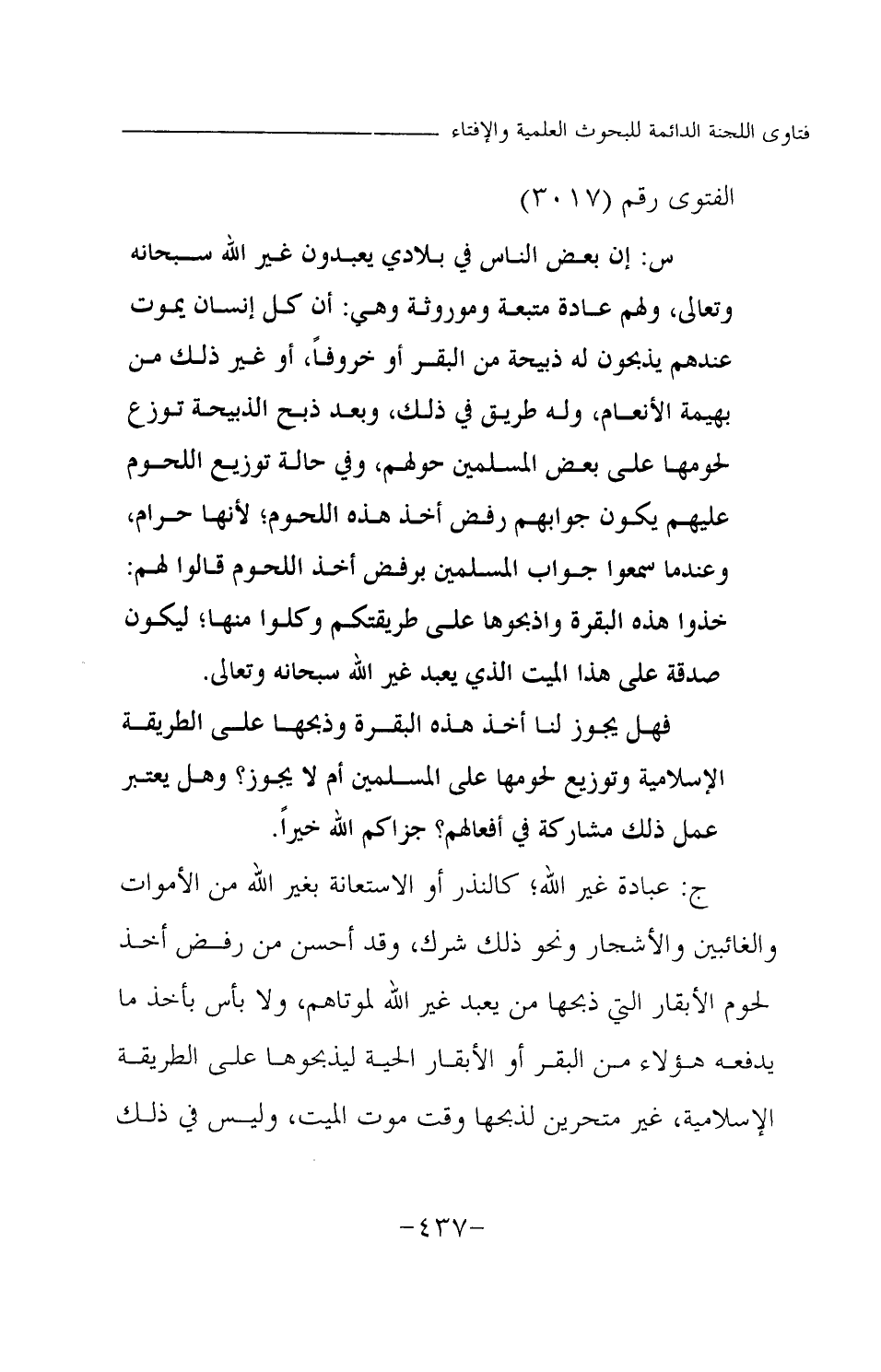 ج: عبادة غير الله، كالنذر أو الاستعانة بغير الله من الأموات والغائبين والأشجار ونحو ذلك شرك، وقد أحسن من رفض أخذ لحوم الأبقار التي ذبحها من يعبد غير الله لموتاهم، ولا بأس بأخذ ما يدفعه هؤلاء من البقر أو الأبقار الحية ليذبحوها على الطريقة الإسلامية، غير متحرين لذبحها وقت موت الميت، وليس في ذلك