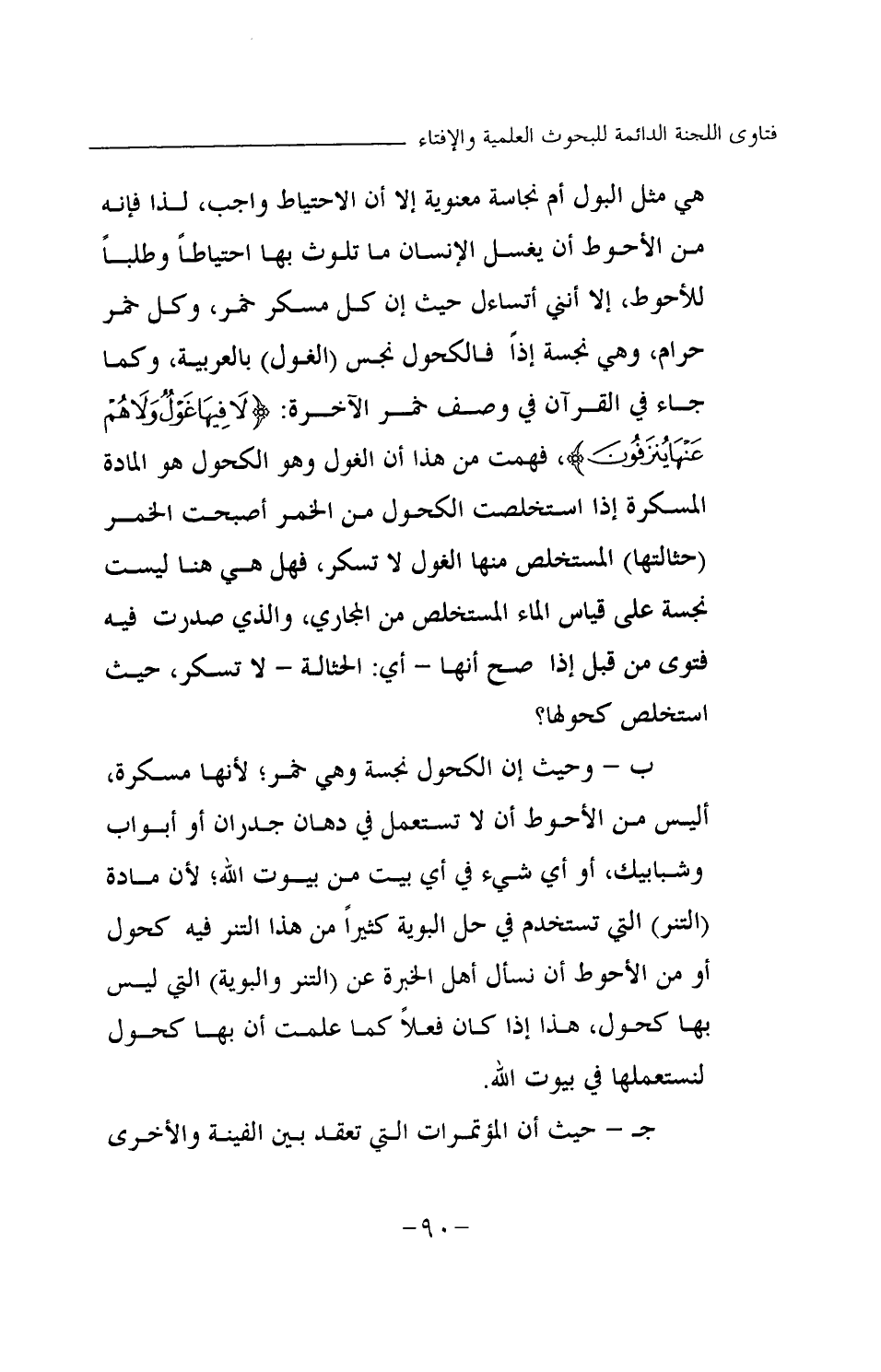 ب- وحيث إن الكحول نجسة وهي خمر؛ لأنها مسكرة، أليس من الأحوط أن لا تستعمل في دهان جدران أو أبواب وشبابيك، أو أي شيء في أي بيت من بيوت الله؛ لأن مادة (التنر) التي تستخدم في حل البوية كثيرا من هذا التنر فيه كحول، أو من الأحوط أن نسأل أهل الخبرة عن (التنر والبوية) التي ليس بها كحول، هذا إذا كان فعلا كما علمت أن بها كحول لنستعملها في بيوت الله.