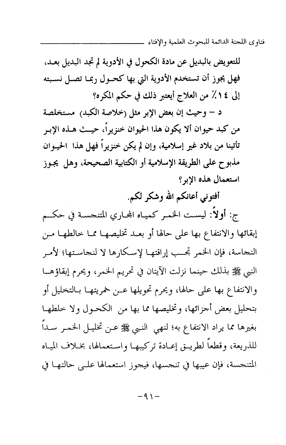 ج: أولا: ليست الخمر كمياه المجاري المتنجسة في حكم إبقائها والانتفاع بها على حالها أو بعد تخليصها مما خالطها من النجاسة، فإن الخمر تجب إراقتها لإسكارها لا لنجاستها؟ لأمر النبي - صلى الله عليه وسلم - بذلك حينما نزلت الآيتان في تحريم الخمر، ويحرم إبقاؤها والانتفاع بها على حالها، ويحرم تحويلها عن خمريتها بالتخليل أو بتحليل بعض أجزائها، وتخليصها مما بها من الكحول ولا خلطها بغيرها مما يراد الانتفاع به؛ لنهي النبي - صلى الله عليه وسلم - عن تخليل الخمر سدا للذريعة، وقطعا لطريق إعادة تركيبها واستعمالها، بخلاف المياه المتنجسة، فإن عيبها في تنجسها، فيجوز استعمالها على حالتها في