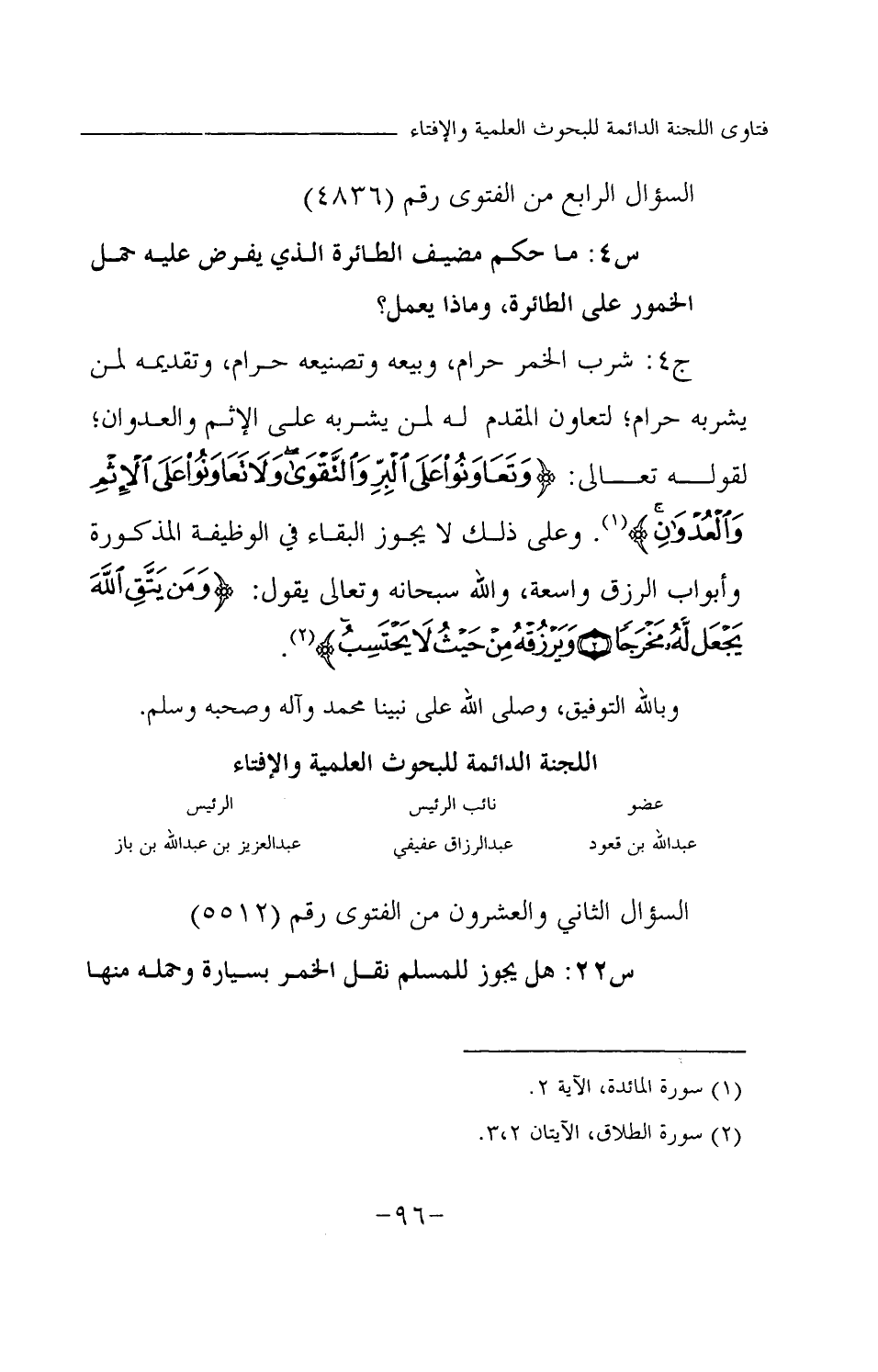 ج4: شرب الخمر حرام، وبيعه وتصنيعه حرام، وتقديمه لمن يشربه حرام؛ لتعاون المقدم له لمن يشربه على الإثم والعدوان؛ لقوله تعالى: {وَتَعَاوَنُوا عَلَى الْبِرِّ وَالتَّقْوَى وَلَا تَعَاوَنُوا عَلَى الْإِثْمِ وَالْعُدْوَانِ} (¬1) وعلى ذلك لا يجوز البقاء في الوظيفة المذكورة وأبواب الرزق واسعة، والله سبحانه وتعالى يقول: {وَمَنْ يَتَّقِ اللَّهَ يَجْعَلْ لَهُ مَخْرَجًا} (¬2) {وَيَرْزُقْهُ مِنْ حَيْثُ لَا يَحْتَسِبُ} (¬3) وبالله التوفيق، وصلى الله على نبينا محمد وآله وصحبه وسلم.