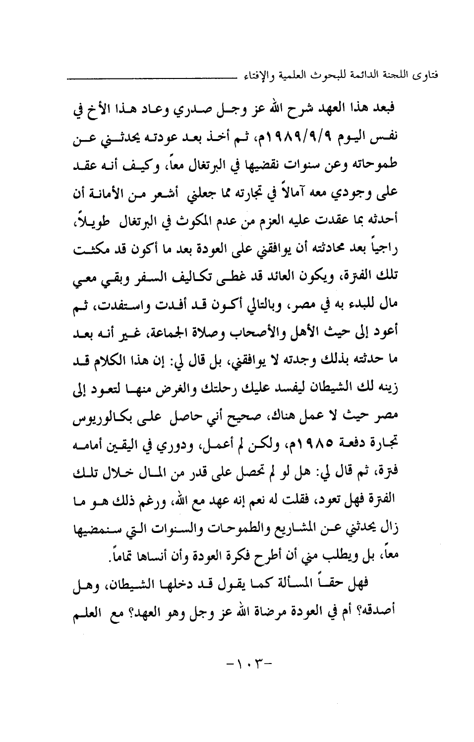 فبعد هذا العهد شرح الله عز وجل صدري وعاد هذا الأخ في نفس اليوم 9 \ 9 \ 1989م، ثم أخذ بعد عودته يحدثني عن طموحاته وعن سنوات نقضيها في البرتغال معا، وكيف أنه عقد على وجودي معه آمالا في تجارته مما جعلني أشعر من الأمانة أن أحدثه بما عقدت عليه العزم من عدم المكوث في البرتغال طويلا، راجيا بعد محادثته أن يوافقني على العودة بعد ما أكون قد مكثت تلك الفترة، ويكون العائد قد غطى تكاليف السفر وبقي معي مال للبدء به في مصر، وبالتالي أكون قد أفدت واستفدت، ثم أعود إلى حيث الأهل والأصحاب وصلاة الجماعة، غير أنه بعدما حدثته بذلك وجدته لا يوافقني، بل قال لي: إن هذا الكلام قد زينه لك الشيطان ليفسد عليك رحلتك والغرض منها لتعود إلى مصر حيث لا عمل هناك، صحيح أني حاصل على بكالوريوس تجارة دفعة 1985م، ولكن لم أعمل، ودوري في اليقين أمامه فترة، ثم قال لي: هل لو لم تحصل على قدر من المال خلال تلك الفترة فهل تعود، فقلت له: نعم، إنه عهد مع الله، ورغم ذلك هو مازال يحدثني عن المشاريع والطموحات والسنوات التي سنمضيها معا، بل ويطلب مني أن أطرح فكرة العودة وأن أنساها تماما.