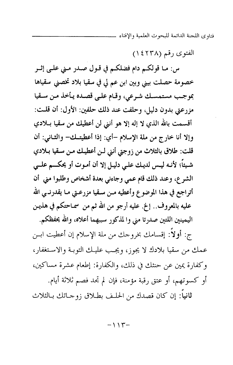 ج: أولا: إقسامك بخروجك من ملة الإسلام إن أعطيت ابن عمك من سقيا بلادك لا يجوز، ويجب عليك التوبة والاستغفار، وكفارة يمين عن حنثك في ذلك، والكفارة: إطعام عشرة مساكين، أو كسوتهم، أو عتق رقبة مؤمنة، فإن لم تجد فصم ثلاثة أيام.