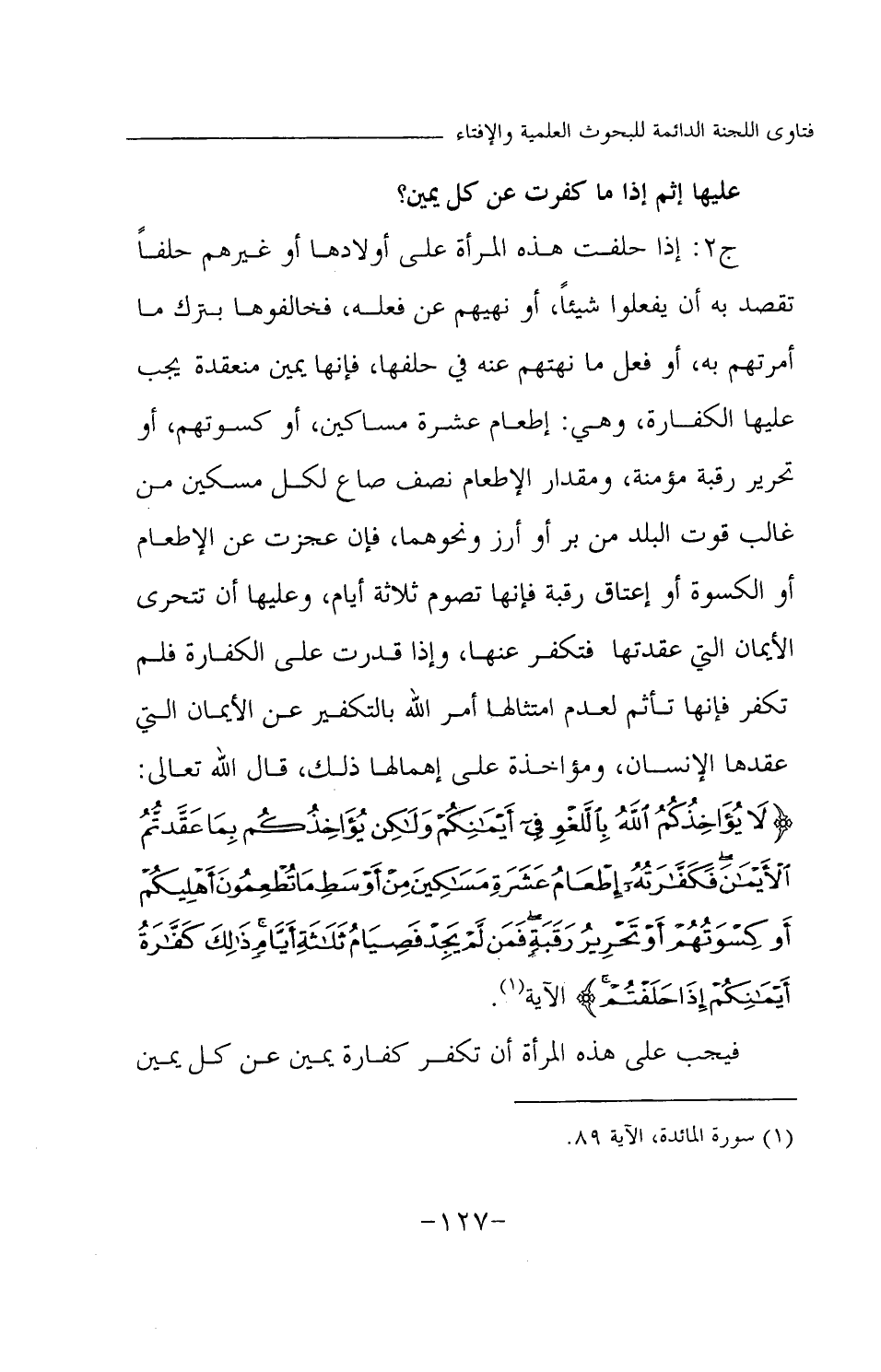 ج 2: إذا حلفت هذه المرأة على أولادها أو غيرهم حلفا تقصد به أن يفعلوا شيئا، أو نهيهم عن فعله، فخالفوها بترك ما أمرتهم به، أو فعل ما نهتهم عنه في حلفها، فإنها يمين منعقدة يجب عليها الكفارة، وهي: إطعام عشرة مساكين، أو كسوتهم، أو تحرير رقبة مؤمنة، ومقدار الإطعام نصف صاع لكل مسكين من غالب قوت البلد من بر أو أرز ونحوهما، فإن عجزت عن الإطعام أو الكسوة أو إعتاق رقبة فإنها تصوم ثلاثة أيام، وعليها أن تتحرى الأيمان التي عقدتها فتكفر عنها، وإذا قدرت على الكفارة فلم تكفر فإنها تأثم لعدم امتثالها أمر الله بالتكفير عن الأيمان التي عقدها الإنسان، ومؤاخذة على إهمالها ذلك، قال الله تعالى: {لَا يُؤَاخِذُكُمُ اللَّهُ بِاللَّغْوِ فِي أَيْمَانِكُمْ وَلَكِنْ يُؤَاخِذُكُمْ بِمَا عَقَّدْتُمُ الْأَيْمَانَ فَكَفَّارَتُهُ إِطْعَامُ عَشَرَةِ مَسَاكِينَ مِنْ أَوْسَطِ مَا تُطْعِمُونَ أَهْلِيكُمْ أَوْ كِسْوَتُهُمْ أَوْ تَحْرِيرُ رَقَبَةٍ فَمَنْ لَمْ يَجِدْ فَصِيَامُ ثَلَاثَةِ أَيَّامٍ ذَلِكَ كَفَّارَةُ أَيْمَانِكُمْ إِذَا حَلَفْتُمْ} (¬1) فيجب على هذه المرأة أن تكفر كفارة يمين عن كل يمين
