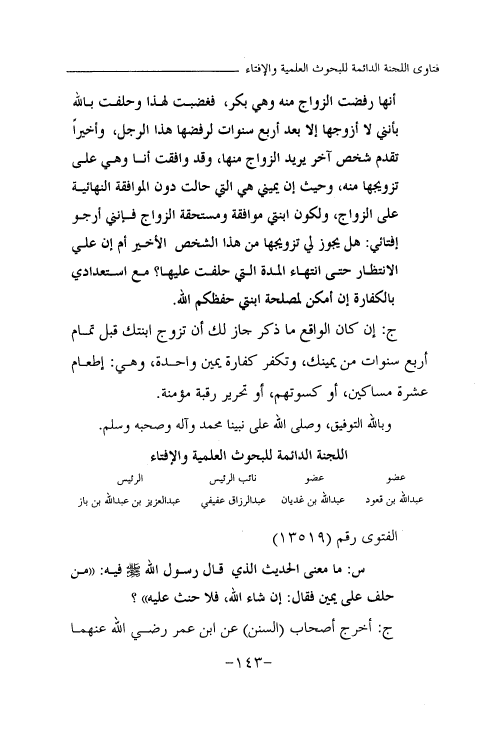 ج: إن كان الواقع ما ذكر جاز لك أن تزوج ابنتك قبل تمام أربع سنوات من يمينك، وتكفر كفارة يمين واحدة، وهي: إطعام عشرة مساكين، أو كسوتهم، أو تحرير رقبة مؤمنة.