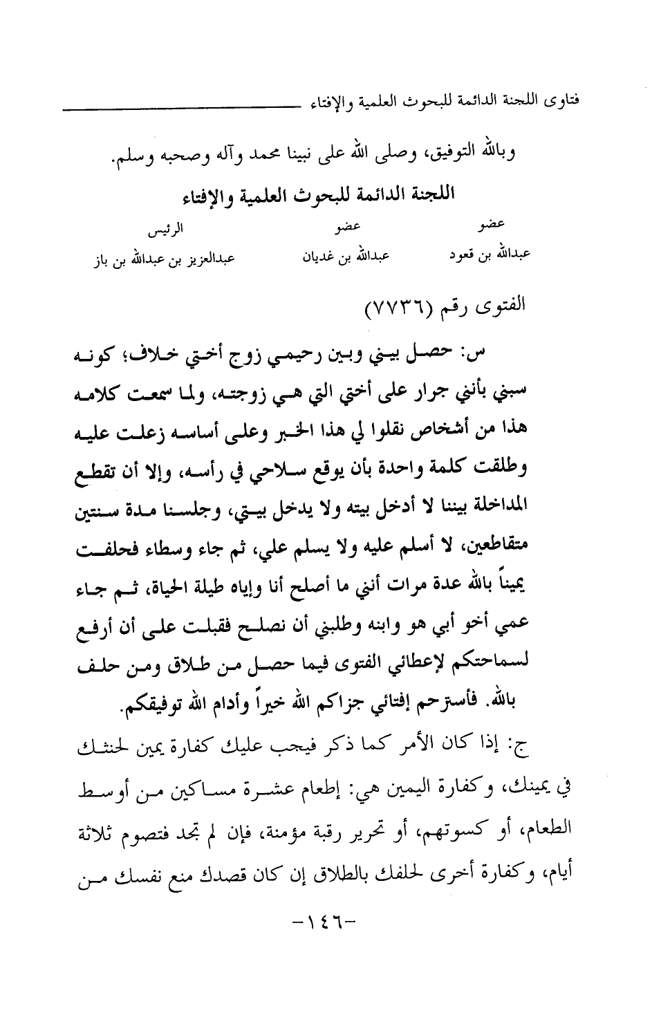 س: حصل بيني وبين رحيمي زوج أختي خلاف، كونه سبني بأنني جرار على أختي التي هي زوجته، ولما سمعت كلامه هذا من أشخاص نقلوا لي هذا الخبر وعلى أساسه زعلت عليه وطلقت كلمة واحدة بأن يوقع سلاحي في رأسه، وإلا أن تقطع المداخلة بيننا لا أدخل بيته ولا يدخل بيتي، وجلسنا هذه سنتين متقاطعين، لا أسلم عليه ولا يسلم علي، ثم جاء وسطاء فحلفت يمينا بالله عدة مرات أنني ما أصلح أنا وإياه طيلة الحياة، ثم جاء عمي أخو أبي هو وابنه وطلبني أن نصلح فقبلت على أن أرفع لسماحتكم لإعطائي الفتوى فيما حصل من طلاق ومن حلف بالله. فأسترحم إفتائي جزاكم الله خيرا وأدام الله توفيقكم.