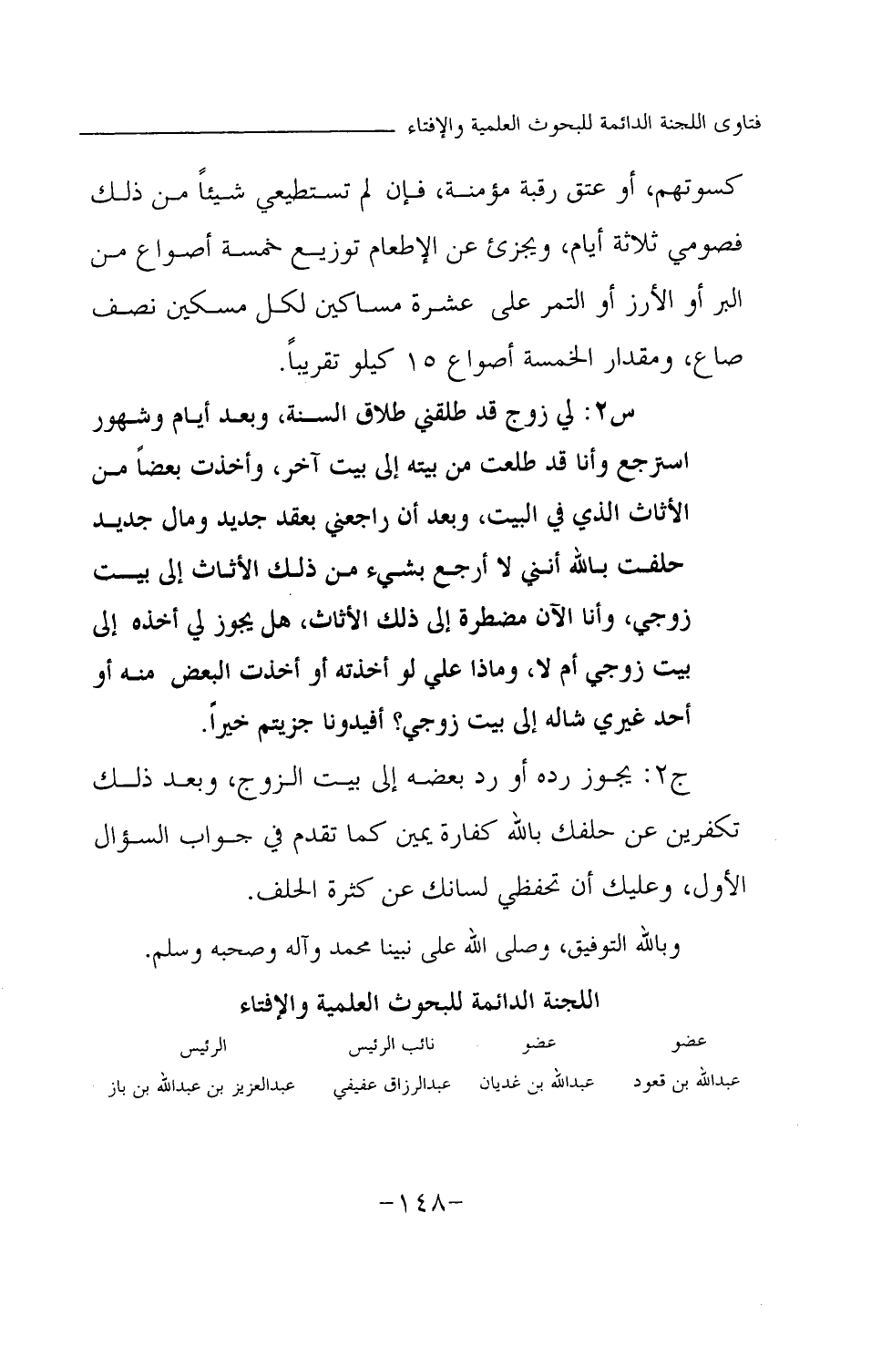 س2: لي زوج قد طلقني طلاق السنة، وبعد أيام وشهور استرجع وأنا قد طلعت من بيته إلى آخر، وأخذت بعضا من الأثاث الذي في البيت، وبعد أن راجعني بعقد جديد ومال جديد حلفت بالله أنني لا أرجع بشيء من ذلك الأثاث إلى بيت زوجي، وأنا الآن مضطرة إلى ذلك الأثاث، هل يجوز لي أخذه إلى بيت زوجي أم لا، وماذا علي لو أخذته أو أخذت البعض منه أو أحد غيري شاله إلى بيت زوجي؟ أفيدونا جزيتم خيرا.