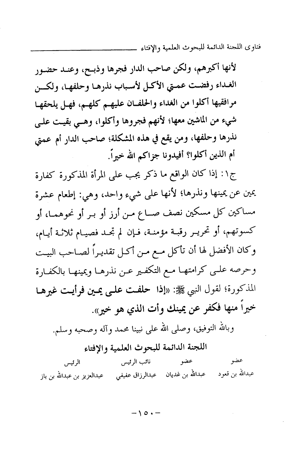 ج1: إذا كان الواقع ما ذكر يجب على المرأة المذكورة كفارة يمين عن يمينها ونذرها؛ لأنها على شيء واحد، وهي: إطعام عشرة مساكين كل مسكين نصف صاع من أرز أو بر أو نحوهما، أو كسوتهم، أو تحرير رقبة مؤمنة، فإن لم تجد فصيام ثلاثة أيام، وكان الأفضل لها أن تأكل مع من أكل تقديرا لصاحب البيت وحرصه على كرامتها مع التكفير عن نذرها ويمينها بالكفارة المذكورة، لقول النبي صلى الله عليه وسلم: «إذا حلفت على يمين فرأيت غيرها خيرا منها فكفر عن يمينك وأت الذي هو خير (¬1) » .