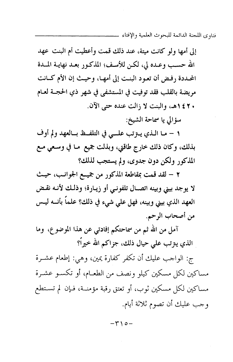 إلى أمها ولو كانت ميتة، عند ذلك قمت وأعطيت أم البنت عهد الله حسب وعده لي، لكن للأسف؛ المذكور بعد نهاية المدة المحددة رفض أن تعود البنت إلى أمها، وحيث إن الأم كانت مريضة بالقلب فقد توفيت في المستشفى في شهر ذي الحجة لعام 1420 هـ، والبنت لا زالت عنده حتى الآن.