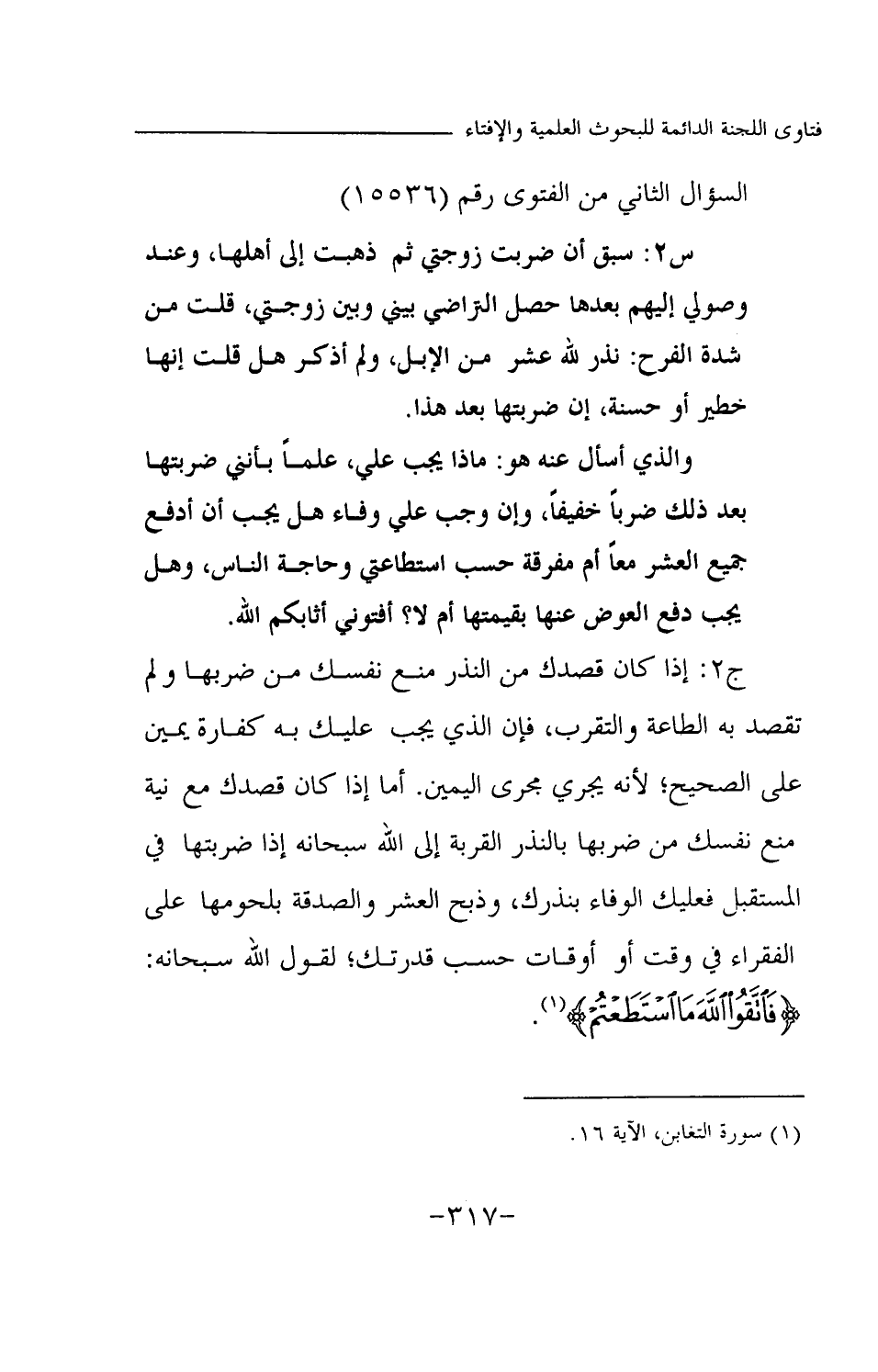 س 2: سبق أن ضربت زوجتي ثم ذهبت إلى أهلها، وعند وصولي إليهم بعدها حصل التراضي بيني وبين زوجتي، قلت من شدة الفرح: نذر لله عشر من الإبل، ولم أذكر هل قلت إنها خطير أو حسنة، إن ضربتها بعد هذا.