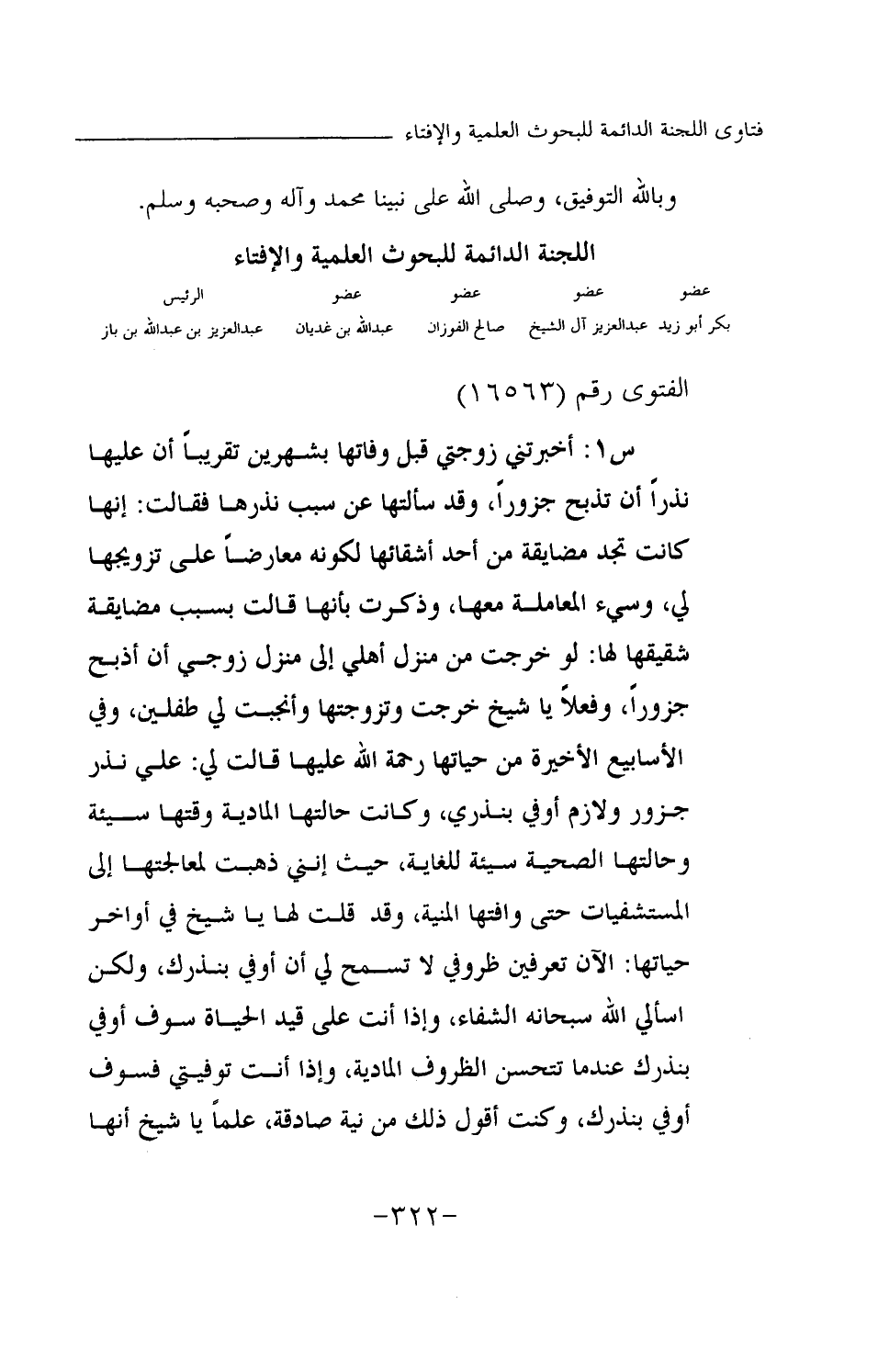 س1: أخبرتني زوجتي قبل وفاتها بشهرين تقريبا أن عليها نذرا أن تذبح جزورا، وقد سألتها عن سبب نذرها فقالت: إنها كانت تجد مضايقة من أحد أشقائها لكونه معارضا على تزويجها لي، وسيئ المعاملة معها، وذكرت بأنها قالت بسبب مضايقة شقيقها لها: لو خرجت من منزل أهلي إلى منزل زوجي أن أذبح جزورا، وفعلا يا شيخ خرجت وتزوجتها وأنجبت لي طفلين، وفي الأسابيع الأخيرة من حياتها رحمة الله عليها قالت لي: علي نذر جزور ولازم أوفي بنذري، وكانت حالتها المادية وقتها سيئة، وحالتها الصحية سيئة للغاية، حيث إنني ذهبت لمعالجتها إلى المستشفيات حتى وافتها المنية، وقد قلت لها يا شيخ في أواخر حياتها: الآن تعرفين ظروفي لا تسمح لي أن أوفي بنذرك، ولكن اسألي الله سبحانه الشفاء، وإذا أنت على قيد الحياة سوف أوفي بنذرك عندما تتحسن الظروف المادية، وإذا أنت توفيتي فسوف أوفي بنذرك، وكنت أقول ذلك من نية صادقة، علما يا شيخ أنها