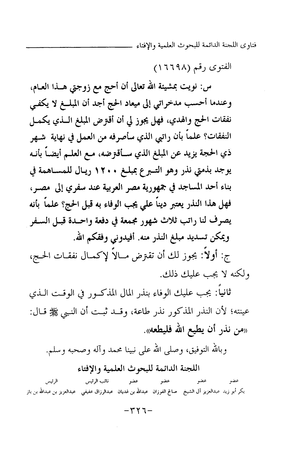 س: نويت بمشيئة الله تعالى أن أحج مع زوجتي هذا العام، وعندما أحسب مدخراتي إلى ميعاد الحج أجد أن المبلغ لا يكفى نفقات الحج والهدي، فهل يجوز لي أن أقترض المبلغ الذي يكمل النفقات؟ علما بأن راتبي الذي سأصرفه من العمل في نهاية شهر ذي الحجة يزيد عن المبلغ الذي سأقترضه، مع العلم أيضا بأنه يوجد بذمتي نذر وهو التبرع بمبلغ 1200 ريال للمساهمة في بناء أحد المساجد في جمهورية مصر العربية عند سفري إلى مصر، فهل هذا النذر يعتبر دينا علي يجب الوفاء به قبل الحج؟ علما بأنه يصرف لنا راتب ثلاث شهور مجمعة في دفعة واحدة قبل السفر، ويمكن تسديد مبلغ النذر منه. أفيدوني وفقكم الله.