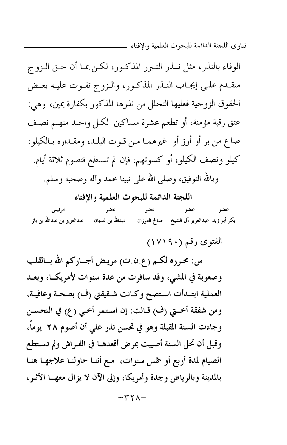 س: محرره لكم (ع. ن. ت) مريض أجاركم الله بالقلب وصعوبة في المشي، وقد سافرت من عدة سنوات لأمريكا، وبعد العملية ابتدأت استصح، وكانت شقيقتي (ف) بصحة وعافية، ومن شفقة أختي (ف) قالت: إن استمر أخي (ع) في التحسن وجاءت السنة المقبلة وهو في تحسن نذر علي أن أصوم 28 يوما، وقبل أن تحل السنة أصيبت بمرض أقعدها في الفراش، ولم تستطع الصيام لمدة أربع أو خمس سنوات، مع أننا حاولنا علاجها هنا بالمدينة وبالرياض وجدة وأمريكا، وإلى الآن لا يزال معها الأثر،