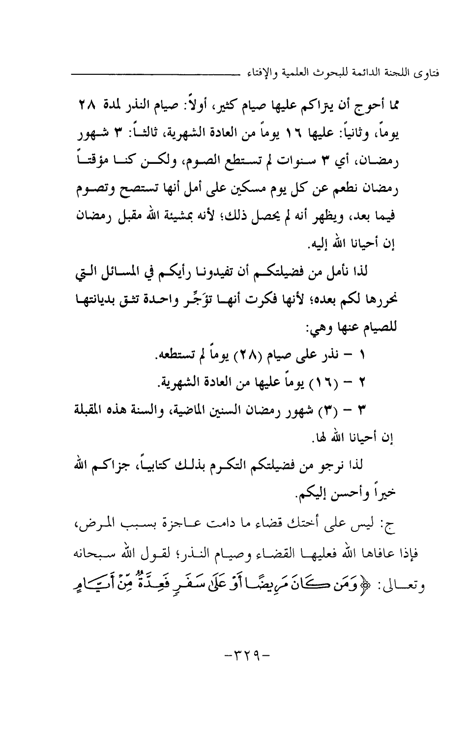 مما أحوج أن يتراكم عليها صيام كثير، أولا: صيام النذر لمدة 28 يوما، وثانيا: عليها 16 يوما من العادة الشهرية، ثالثا: 3 شهور رمضان، أي 3 سنوات لم تستطع الصوم، ولكن كنا مؤقتا رمضان نطعم عن كل يوم مسكين على أمل أنها تستصح وتصوم فيما بعد، ويظهر أنه لم يحصل ذلك؛ لأنه بمشيئة الله مقبل رمضان إن أحيانا الله إليه.