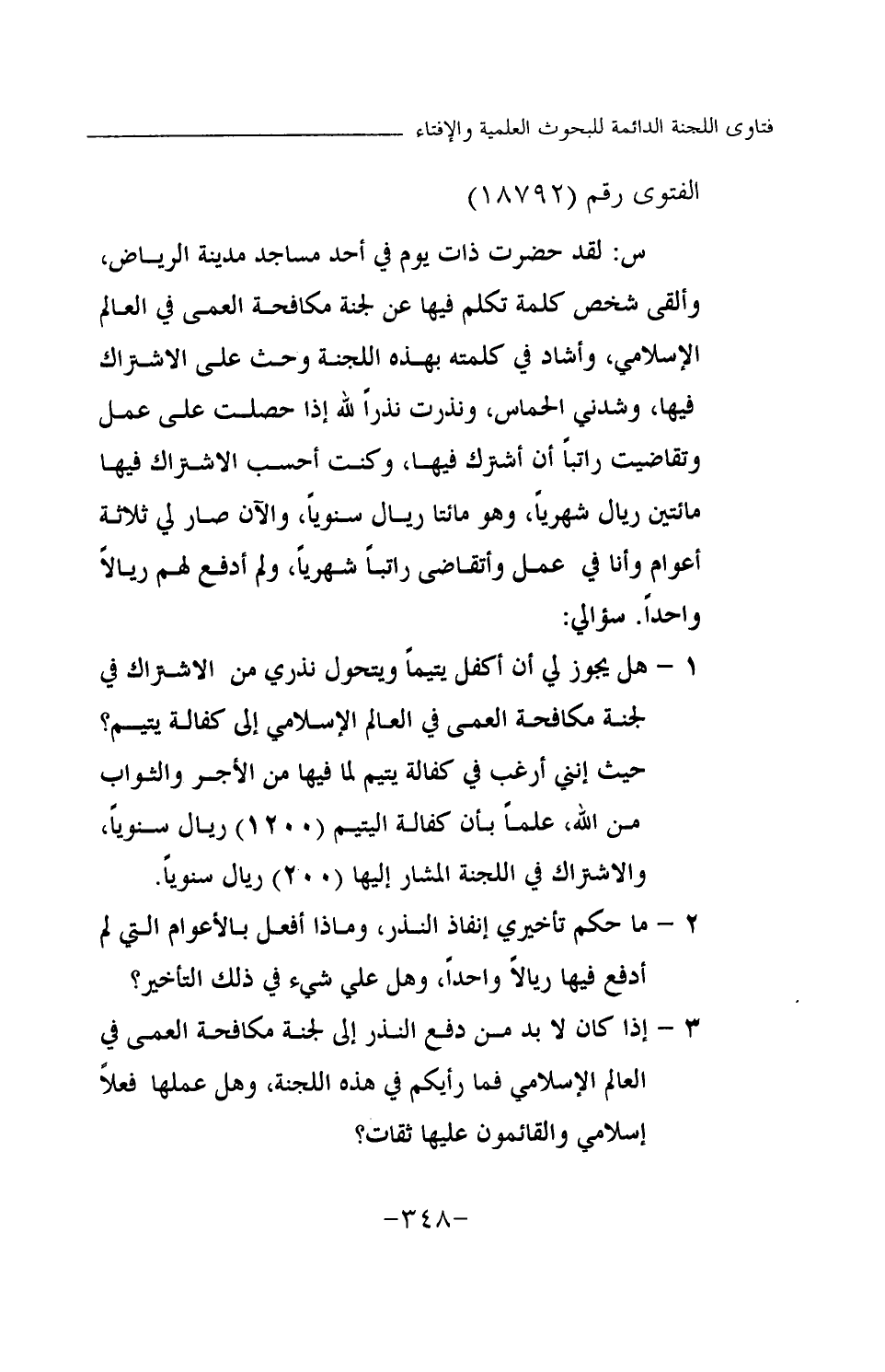 س: لقد حضرت ذات يوم في أحد مساجد مدينة الرياض، وألقى شخص كلمة تكلم فيها عن لجنة مكافحة العمى في العالم الإسلامي، وأشاد في كلمته بهذه اللجنة، وحث على الاشتراك فيها، وشدني الحماس، ونذرت نذرا لله إذا حصلت على عمل وتقاضيت راتبا أن أشترك فيها، وكنت أحسب الاشتراك فيها مائتين ريال شهريا، وهو مائتا ريال سنويا، والآن صار لي ثلاثة أعوام وأنا في عمل وأتقاضى راتبا شهريا، ولم أدفع لهم ريالا واحدا. سؤالي: