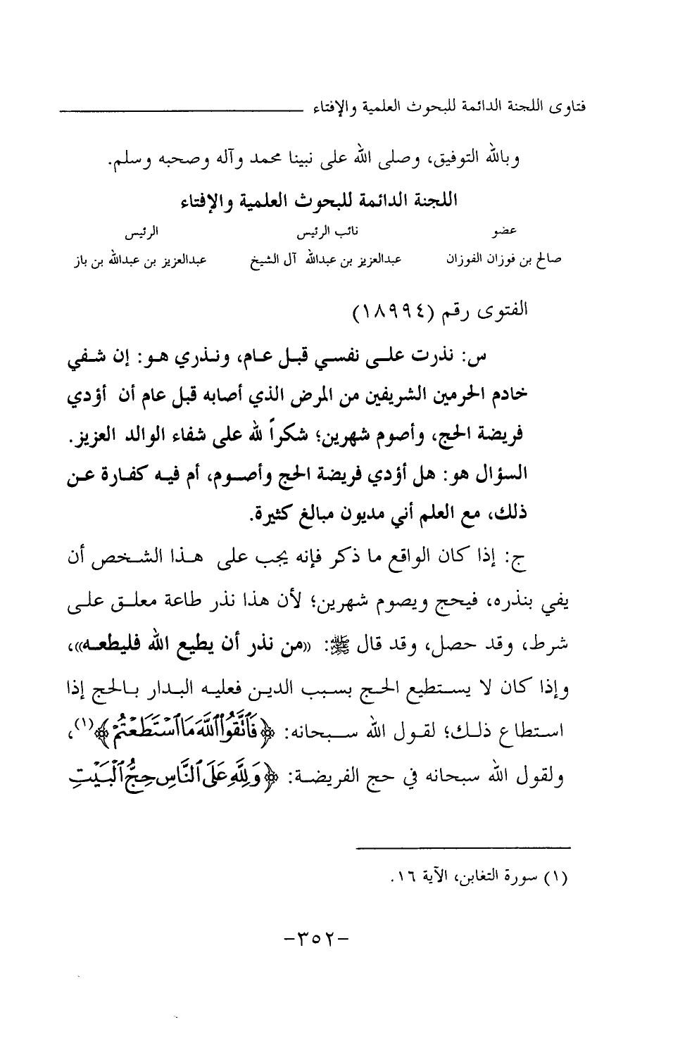 ج: إذا كان الواقع ما ذكر، فإنه يجب على هذا الشخص أن يفي بنذره، فيحج ويصوم شهرين؛ لأن هذا نذر طاعة معلق على شرط، وقد حصل، وقد قال صلى الله عليه وسلم: «من نذر أن يطيع الله فليطعه (¬1) » ، وإذا كان لا يستطيع الحج بسبب الدين فعليه البدار بالحج إذا استطاع ذلك؛ لقول الله سبحانه: {فَاتَّقُوا اللَّهَ مَا اسْتَطَعْتُمْ} (¬2) ولقول الله سبحانه في حج الفريضة: {وَلِلَّهِ عَلَى النَّاسِ حِجُّ الْبَيْتِ مَنِ اسْتَطَاعَ إِلَيْهِ سَبِيلًا} (¬3)