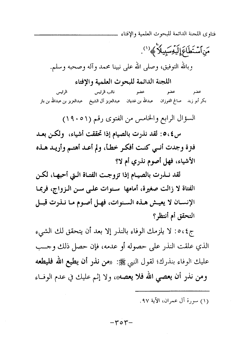 ج 4، 5: لا يلزمك الوفاء بالنذر إلا بعد أن يتحقق لك الشيء الذي علقت النذر على حصوله أو عدمه، فإن حصل ذلك وجب عليك الوفاء بنذرك؛ لقول النبي صلى الله عليه وسلم: «من نذر أن يطيع الله فليطعه، ومن نذر أن يعصي الله فلا يعصه (¬1) » ، ولا إثم عليك في عدم الوفاء