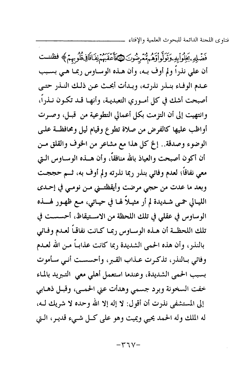 {فَلَمَّا آتَاهُمْ مِنْ فَضْلِهِ بَخِلُوا بِهِ وَتَوَلَّوْا وَهُمْ مُعْرِضُونَ} (¬1) {فَأَعْقَبَهُمْ نِفَاقًا فِي قُلُوبِهِمْ} (¬2) فظننت أن علي نذرا ولم أوف به، وأن هذه الوساوس ربما هي بسبب عدم الوفاء بنذر نذرته، وبدأت أبحث عن ذلك النذر حتى أصبحت أشك في كل أموري التعبدية، وأنها قد تكون نذرا، وانتهيت إلى أن التزمت بكل أعمالي التطوعية من قبل، وصرت أواظب عليها كالفرض من صلاة تطوع وقيام ليل ومحافظة على الوضوء وصدقة. . إلخ، كل هذا مع مشاعر من الخوف والقلق من أن أكون أصبحت والعياذ بالله منافقا، وأن هذه الوساوس التي معي نفاقا، لعدم وفائي بنذر ربما نذرته ولم أوف به، ثم حججت وبعد ما عدت من حجي مرضت، وأيقظتني من نومي في إحدى الليالي حمى شديدة لم أر مثيلا لها في حياتي، مع ظهور لهذه الوساوس في عقلي في تلك اللحظة من الاستيقاظ، أحسست في تلك اللحظة أن هذه الوساوس ربما كانت نفاقا لعدم وفائي بالنذر، وأن هذه الحمى الشديدة ربما كانت عذابا من الله لعدم وفائي بالنذر، تذكرت عذاب القبر، وأحسست أني سأموت بسبب الحمى الشديدة، وعندما استعمل أهلي معي التبريد بالماء خفت السخونة، وبرد جسمي، وهدأت عني الحمى، وقبل ذهابي إلى المستشفى نذرت أن أقول: لا إله إلا الله وحده لا شريك له، له الملك وله الحمد، يحيي ويميت وهو على كل شيء قدير، التي