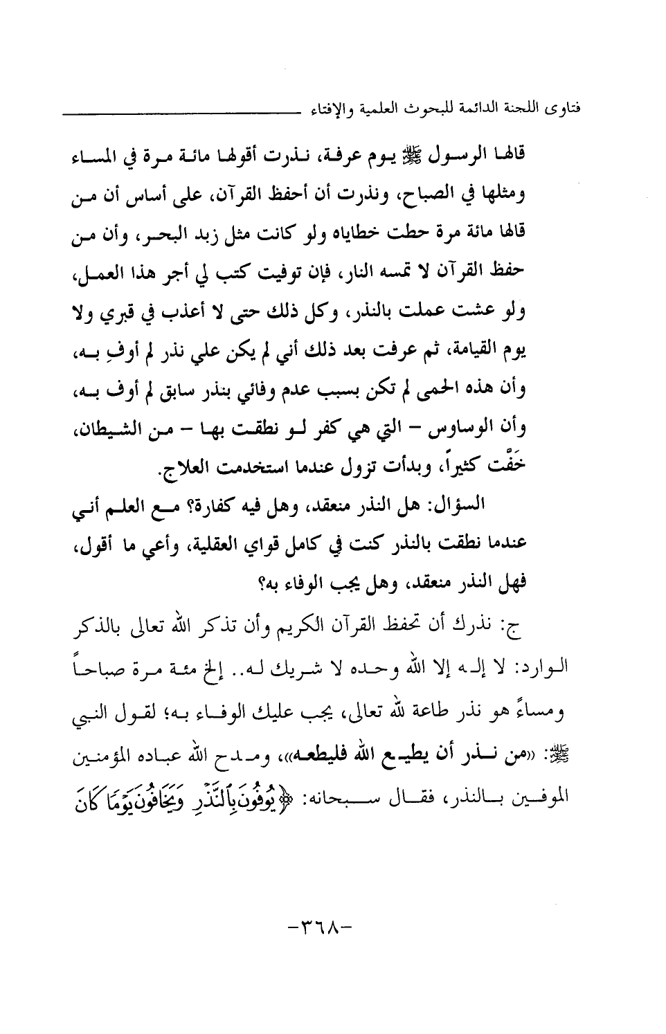 قالها الرسول صلى الله عليه وسلم يوم عرفة، نذرت أقولها مائة مرة في المساء ومثلها في الصباح، ونذرت أن أحفظ القرآن، على أساس أن من قالها مائة مرة حطت خطاياه ولو كانت مثل زبد البحر، وأن من حفظ القرآن لا تمسه النار، فإن توفيت كتب لي أجر هذا العمل، ولو عشت عملت بالنذر، وكل ذلك حتى لا أعذب في قبري ولا يوم القيامة، ثم عرفت بعد ذلك أني لم يكن علي نذر لم أوف به، وأن هذه الحمى لم تكن بسبب عدم وفائي بنذر سابق لم أوف به، وأن الوساوس- التي هي كفر لو نطقت بها- من الشيطان، خفت كثيرا، وبدأت تزول عندما استخدمت العلاج. السؤال: هل النذر منعقد، وهل فيه كفارة؟ مع العلم أني عندما نطقت بالنذر كنت في كامل قواي العقلية، وأعي ما أقول، فهل النذر منعقد، وهل يجب الوفاء به؟