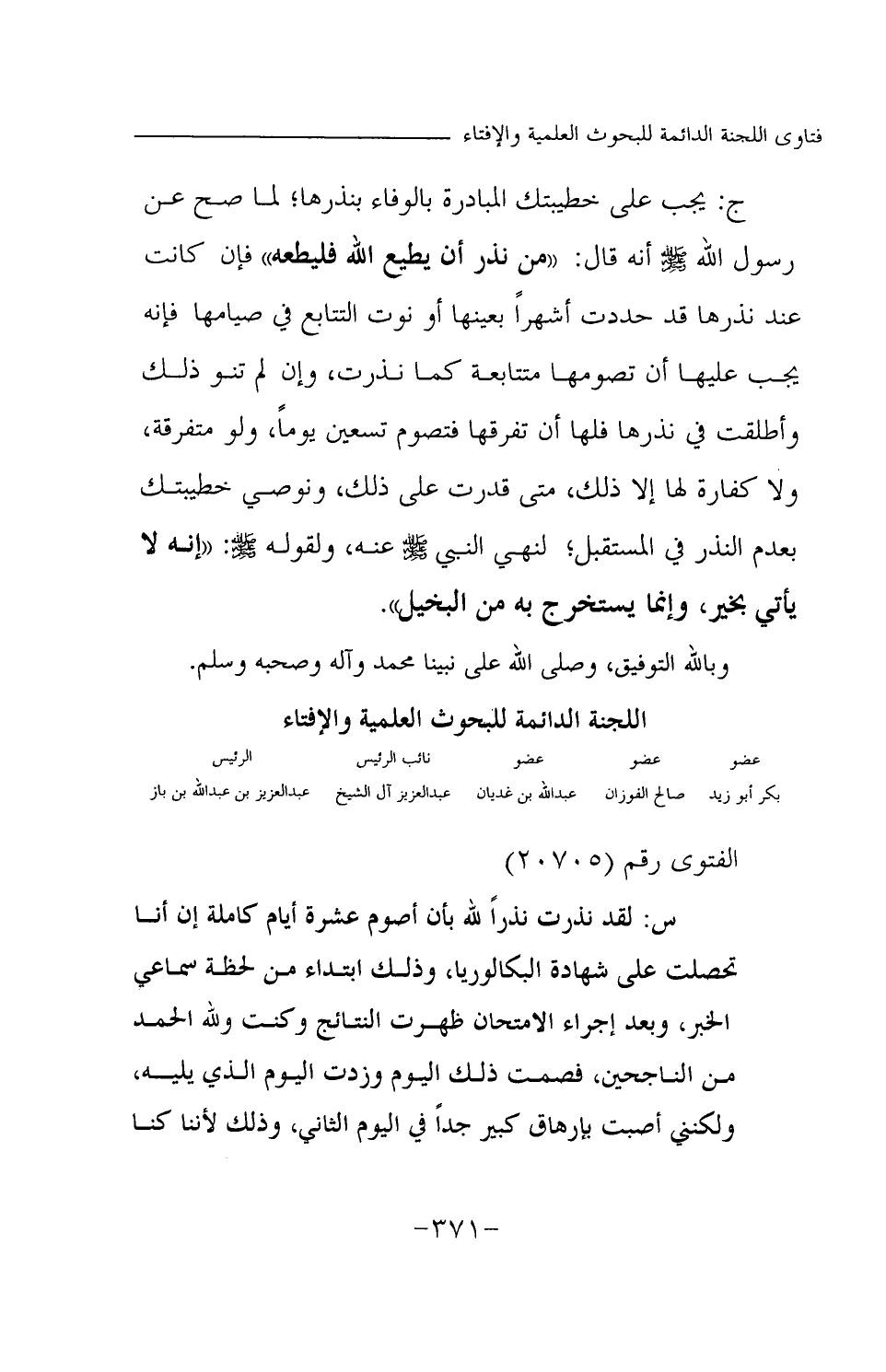 س: لقد نذرت نذرا لله بأن أصوم عشرة أيام كاملة إن أنا تحصلت على شهادة البكالوريا، وذلك ابتداء من لحظة سماعي الخبر، وبعد إجراء الامتحان ظهرت النتائج، وكنت ولله الحمد من الناجحين، فصمت ذلك اليوم وزدت اليوم الذي يليه، ولكني أصبت بإرهاق كبير جدا في اليوم الثاني، وذلك لأننا كنا
