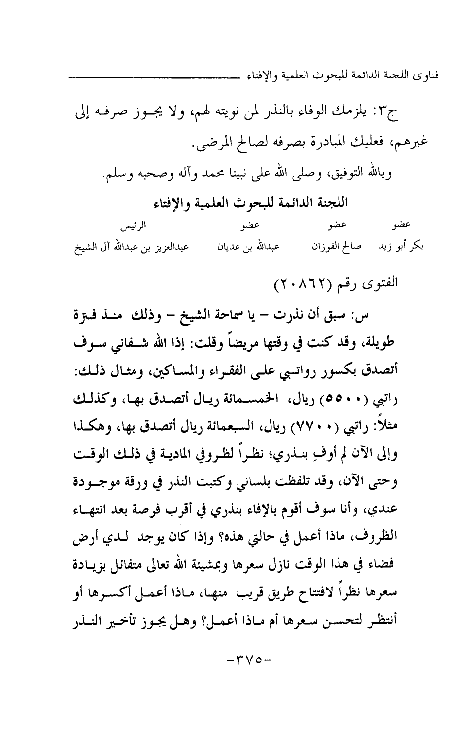 س: سبق أن نذرت- يا سماحة الشيخ- وذلك منذ فترة طويلة، وقد كنت في وقتها مريضا وقلت: إذا الله شفاني سوف أتصدق بكسور رواتبي على الفقراء والمساكين، ومثال ذلك: راتبي (5500) ريال، الخمسمائة ريال أتصدق بها، وكذلك مثلا: راتبي (7700) ريال، السبعمائة ريال أتصدق بها، وهكذا، وإلى الآن لم أوف بنذري؛ نظرا لظروفي المادية في ذلك الوقت وحتى الآن، وقد تلفظت بلساني وكتبت النذر في ورقة موجودة عندي، وأنا سوف أقوم بالإفاء بنذري في أقرب فرصة بعد انتهاء الظروف، ماذا أعمل في حالتي هذه؟ وإذا كان يوجد لدي أرض فضاء في هذا الوقت نازل سعرها، وبمشيئة الله تعالى متفائل بزيادة سعرها؛ نظرا لافتتاح طريق قريب منها، ماذا أعمل، أكسرها، أو أنتظر لتحسن سعرها، أم ماذا أعمل؟ وهل يجوز تأخير النذر