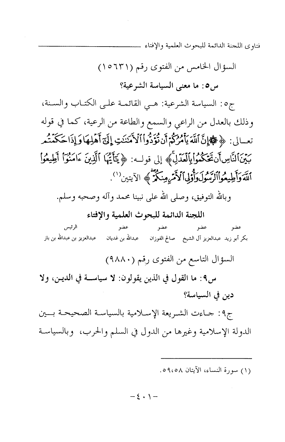 ج5: السياسة الشرعية: هي القائمة على الكتاب والسنة، وذلك بالعدل من الراعي والسمع والطاعة من الرعية، كما في قوله تعالى: {إِنَّ اللَّهَ يَأْمُرُكُمْ أَنْ تُؤَدُّوا الْأَمَانَاتِ إِلَى أَهْلِهَا وَإِذَا حَكَمْتُمْ بَيْنَ النَّاسِ أَنْ تَحْكُمُوا بِالْعَدْلِ} (¬1) إلى قوله: {يَا أَيُّهَا الَّذِينَ آمَنُوا أَطِيعُوا اللَّهَ وَأَطِيعُوا الرَّسُولَ وَأُولِي الْأَمْرِ مِنْكُمْ} (¬2) الآيتين وبالله التوفيق، وصلى الله على نبينا محمد وآله وصحبه وسلم.