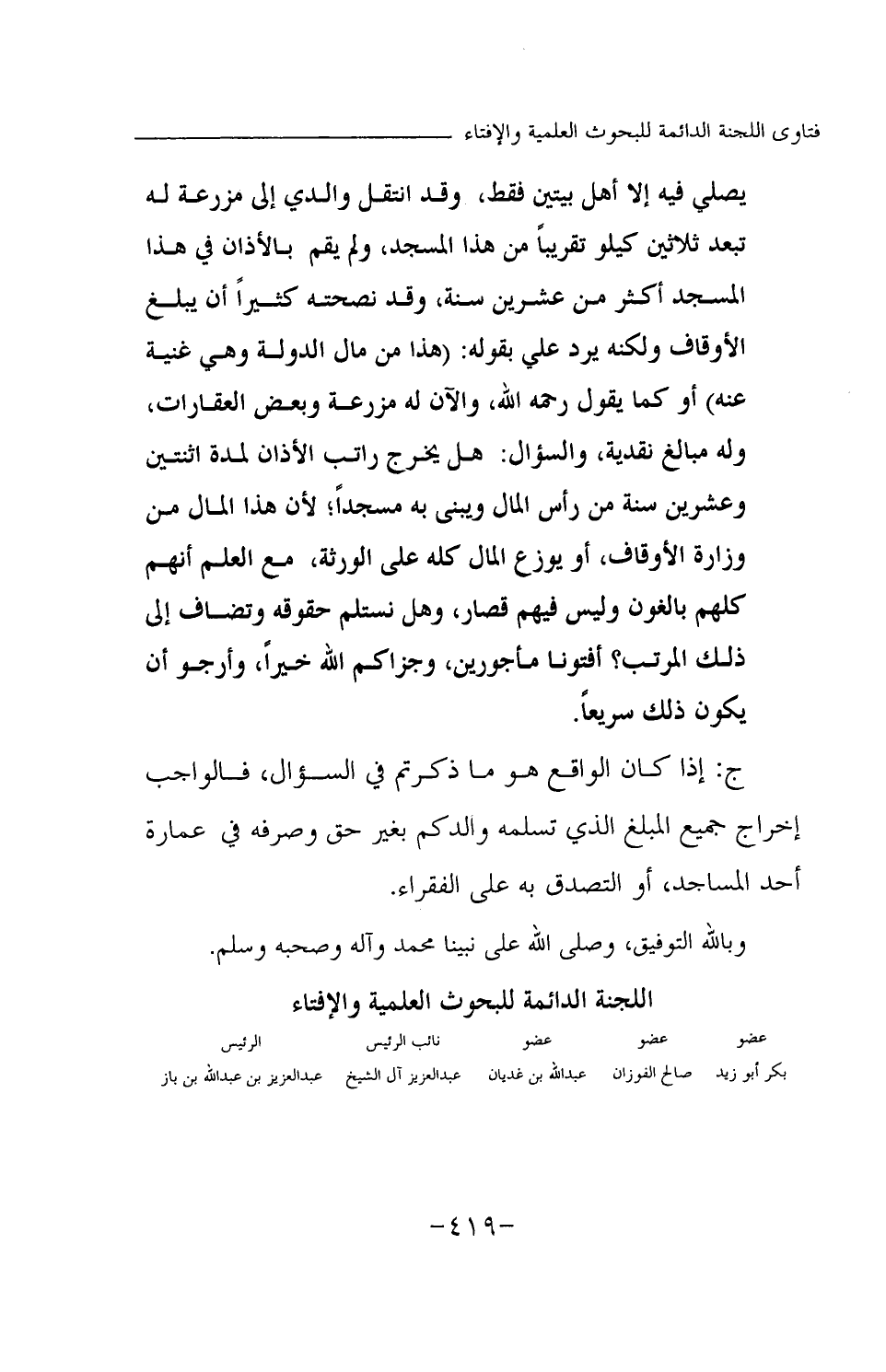 يصلي فيه إلا أهل بيتين فقط، وقد انتقل والدي إلى مزرعة له تبعد ثلاثين كيلو تقريبا من هذا المسجد، ولم يقم بالأذان في هذا المسجد أكثر من عشرين سنة، وقد نصحته كثيرا أن يبلغ الأوقاف ولكنه يرد علي بقوله: (هذا من مال الدولة وهي غنية عنه) أو كما يقول رحمه الله، والآن له مزرعة وبعض العقارات، وله مبالغ نقدية، والسؤال: هل يخرج راتب الأذان لمدة اثنتين وعشرين سنة من رأس المال ويبني به مسجدا؛ لأن هذا المال من وزارة الأوقاف، أو يوزع المال كله على الورثة، مع العلم أنهم كلهم بالغون وليس فيهم قصار، وهل نستلم حقوقه وتضاف إلى ذلك المرتب؟ أفتونا مأجورين، وجزاكم الله خيرا، وأرجو أن يكون ذلك سريعا.