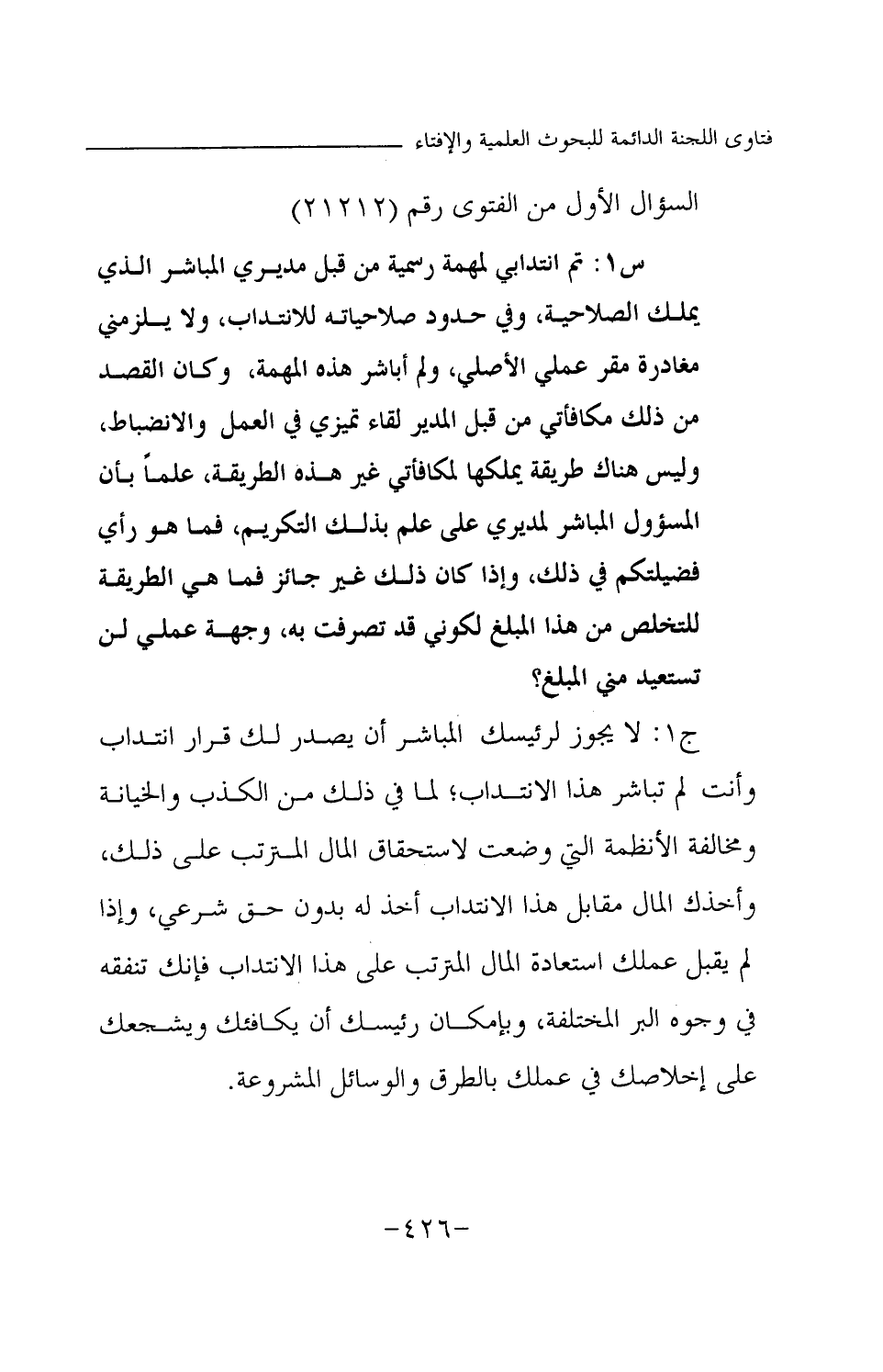 س1: تم انتدابي لمهمة رسمية من قبل مديري المباشر الذي يملك الصلاحية، وفي حدود صلاحياته للانتداب، ولا يلزمني مغادرة مقر عملي الأصلي، ولم أباشر هذه المهمة، وكان القصد من ذلك مكافأتي من قبل المدير لقاء تميزي في العمل والانضباط، وليس هناك طريقة يملكها لمكافأتي غير هذه الطريقة، علما بأن المسؤول المباشر لمديري على علم بذلك التكريم، فما هو رأي فضيلتكم في ذلك، وإذا كان ذلك غير جائز فما هي الطريقة للتخلص من هذا المبلغ لكوني قد تصرفت به، وجهة عملي لن تستعيد مني المبلغ؟