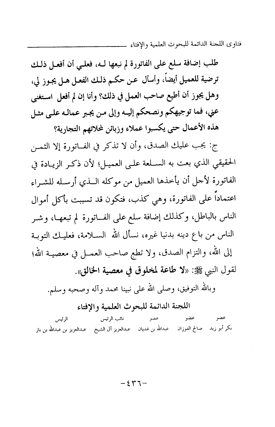 ج: يجب عليك الصدق، وأن لا تذكر في الفاتورة إلا الثمن الحقيقي الذي بعت به السلعة على العميل؛ لأن ذكر الزيادة في الفاتورة لأجل أن يأخذها العميل من موكله الذي أرسله للشراء اعتمادا على الفاتورة، وهي كذب، فتكون قد تسببت بأكل أموال الناس بالباطل، وكذلك إضافة سلع على الفاتورة لم تبعها، وشر الناس من باع دينه بدنيا غيره، نسأل الله السلامة، فعليك التوبة إلى الله، والتزام الصدق، ولا تطع صاحب العمل في معصية الله، لقول النبي صلى الله عليه وسلم: «لا طاعة لمخلوق في معصية الخالق (¬1) » .