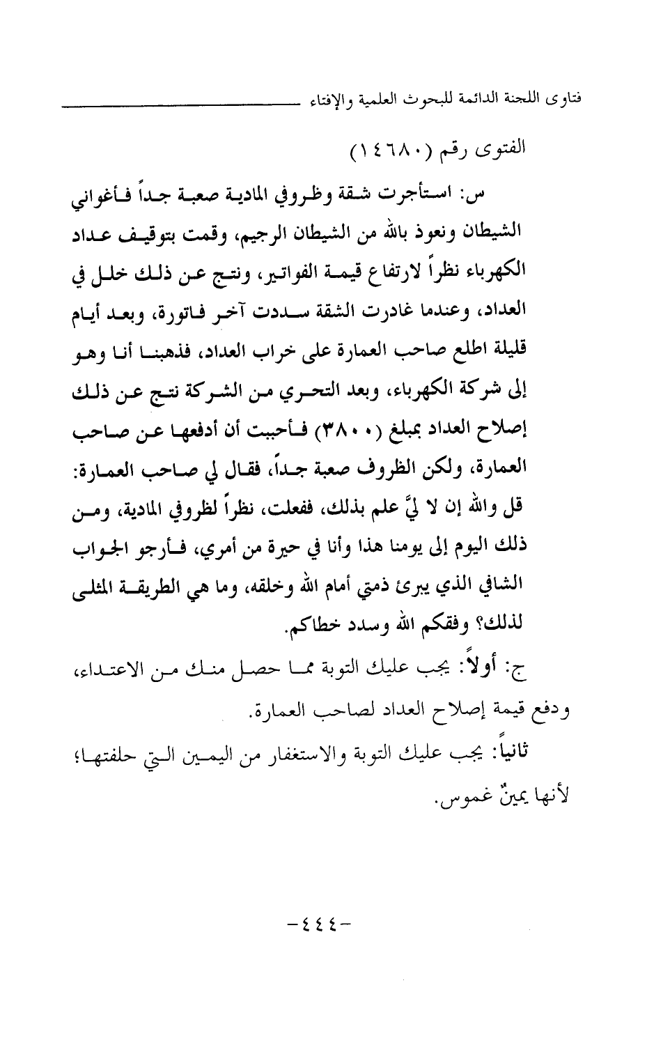 س: استأجرت شقة وظروفي المادية صعبة جدا فأغواني الشيطان ونعوذ بالله من الشيطان الرجيم، وقمت بتوقيف عداد الكهرباء نظرا لارتفاع قيمة الفواتير، ونتج عن ذلك خلل في العداد، وعندما غادرت الشقة سددت آخر فاتورة، وبعد أيام قليلة اطلع صاحب العمارة على خراب العداد، فذهبنا أنا وهو إلى شركة الكهرباء، وبعد التحري من الشركة نتج عن ذلك إصلاح العداد بمبلغ (3800) فأحببت أن أدفعها عن صاحب العمارة، ولكن الظروف صعبة جدا، فقال لي صاحب العمارة: قل والله إن لا لي علم بذلك، ففعلت، نظرا لظروفي المادية، ومن ذلك اليوم إلى يومنا هذا وأنا في حيرة من أمري، فأرجو الجواب الشافي في الذي يبرئ ذمتي أمام الله وخلقه، وما هي الطريقة المثلى لذلك؟ وفقكم الله وسدد خطاكم.