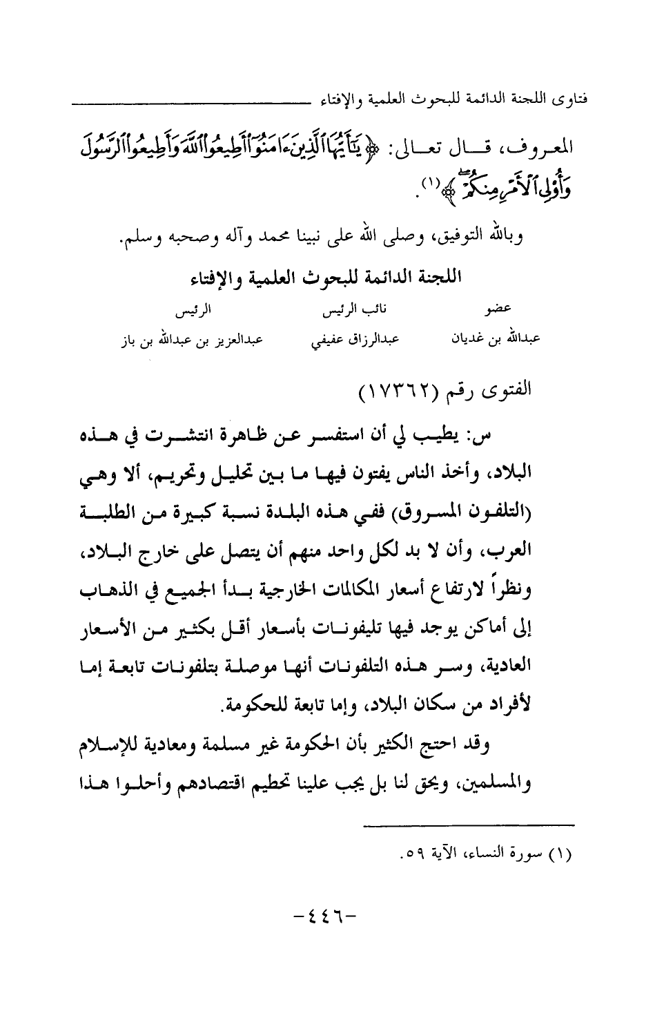 س: يطيب لي أن استفسر عن ظاهرة انتشرت في هذه البلاد، وأخذ الناس يفتون فيها ما بين تحليل وتحريم، ألا وهي (التلفون المسروق) ففي هذه البلدة نسبة كبيرة من الطلبة العرب، وأن لا بد لكل واحد منهم أن يتصل على خارج البلاد، ونظرا لارتفاع أسعار المكالمات الخارجية بدأ الجميع في الذهاب إلى أماكن يوجد فيها تليفونات بأسعار أقل بكثير من الأسعار العادية، وسر هذه التلفونات أنها موصلة بتلفونات تابعة إما لأفراد من سكان البلاد، وإما تابعة للحكومة.