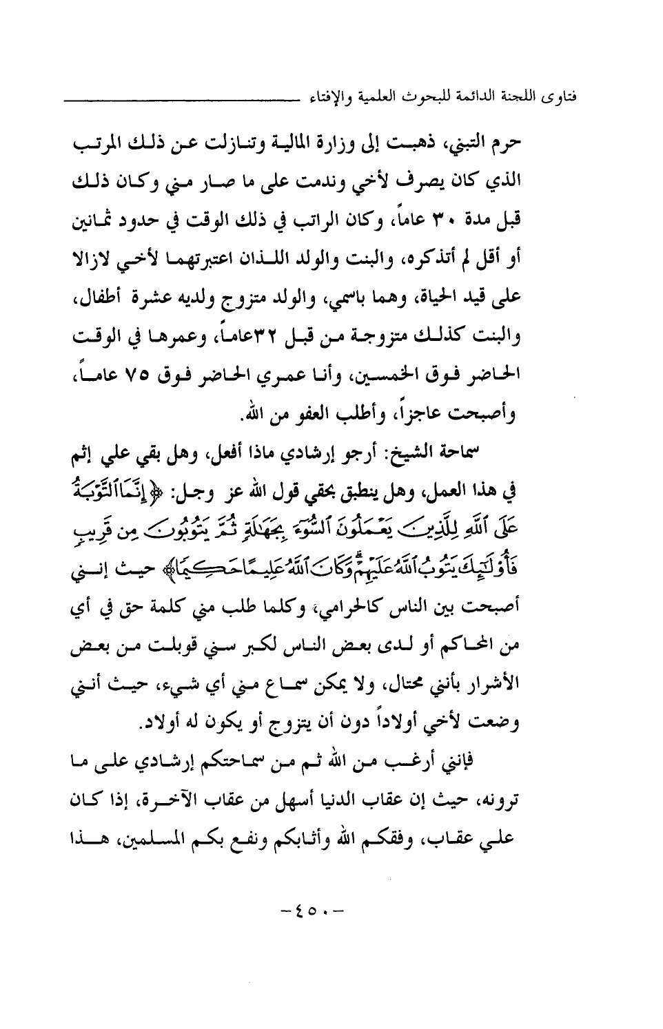 سماحة الشيخ: أرجو إرشادي ماذا أفعل، وهل بقي علي إثم في هذا العمل، وهل ينطبق بحقي قول الله عز وجل: {إِنَّمَا التَّوْبَةُ عَلَى اللَّهِ لِلَّذِينَ يَعْمَلُونَ السُّوءَ بِجَهَالَةٍ ثُمَّ يَتُوبُونَ مِنْ قَرِيبٍ فَأُولَئِكَ يَتُوبُ اللَّهُ عَلَيْهِمْ وَكَانَ اللَّهُ عَلِيمًا حَكِيمًا} (¬1) حيث إنني أصبحت بين الناس كالحرامي، وكلما طلب مني كلمة حق في أي من المحاكم أو لدى بعض الناس لكبر سني قوبلت من بعض الأشرار بأنني محتال، ولا يمكن سماع مني أي شيء، حيث إنني وضعت لأخي أولادا دون أن يتزوج أو يكون له أولاد.
