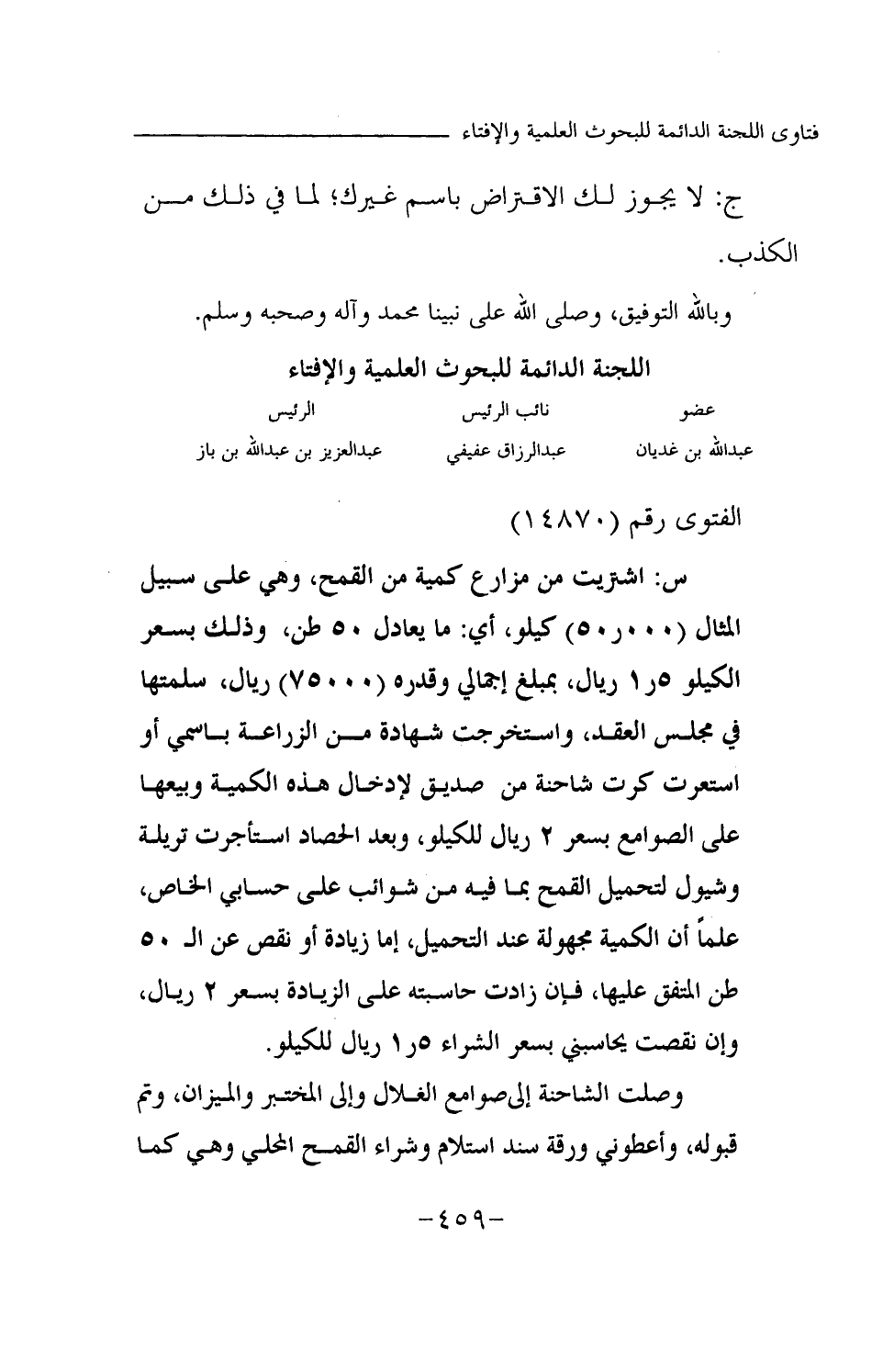 س: اشتريت من مزارع كمية من القمح، وهي على سبيل المثال (50000) كيلو، أي: ما يعادل 50 طن، وذلك بسعر الكيلو 1.5 ريال، بمبلغ إجمالي وقدره (75000) ريال، سلمتها في مجلس العقد، واستخرجت شهادة من الزراعة باسمي أو استعرت كرت شاحنة من صديق لإدخال هذه الكمية وبيعها على الصوامع بسعر 2 ريال للكيلو، وبعد الحصاد استأجرت تريلة وشيول لتحميل القمح بما فيه من شوائب على حسابي الخاص، علما أن الكمية مجهولة عند التحميل، إما زيادة أو نقص عن ال 50 طن المتفق عليها، فإن زادت حاسبته على الزيادة بسعر 2 ريال، وإن نقصت يحاسبني بسعر الشراء 1.5 ريال للكيلو.