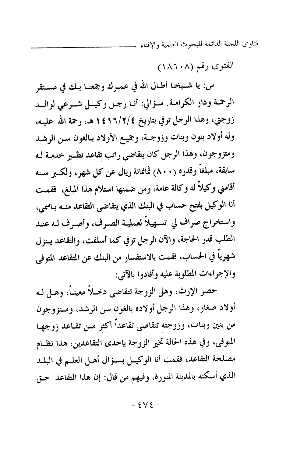 س: يا شيخنا أطال الله في عمرك وجمعنا بك في مستقر الرحمة ودار الكرامة. سؤالي: أنا رجل وكيل شرعي لوالد زوجتي، وهذا الرجل توفي بتاريخ 4 \ 2 \ 1416 هـ، رحمة الله عليه، وله أولاد بنون وبنات وزوجة، وجميع الأولاد بالغون سن الرشد ومتزوجون، وهذا الرجل كان يتقاضى راتب تقاعد نظير خدمة له سابقة، مبلغا وقدر (800) ثمانمائة ريال عن كل شهر، ولكبر سنه أقامني وكيلا له وكالة عامة، ومن ضمنها استلام هذا المبلغ، فقمت أنا الوكيل بفتح حساب في البنك الذي يتقاضى التقاعد منه باسمي، واستخراج صراف لي تسهيلا لعملية الصرف، وأصرف له عند الطلب قدر الحاجة، والآن الرجل توفي كما أسلفت، والتعاقد ينزل شهريا في الحساب، فقمت بالاستفسار من البنك عن المتقاعد المتوفى والإجراءات المطلوبة عليه وأفادوا بالآتي: